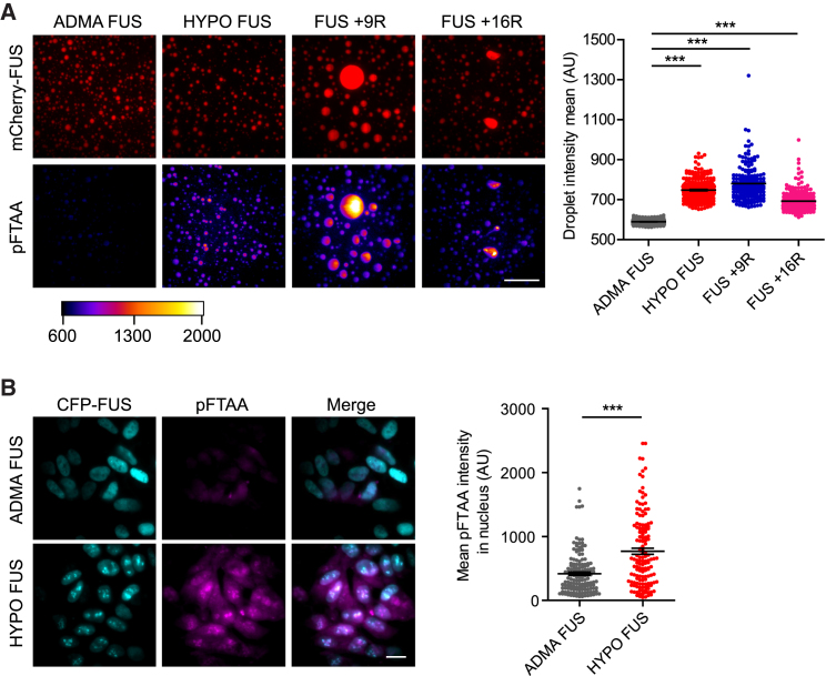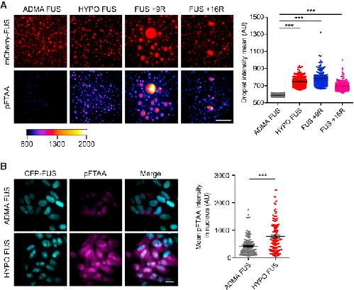 Figure 5. pFTAA Differentially Binds and Fluoresces with FUS Hydrogel Condensates(A) Representative images of mCherry-tagged FUS (red, top row) labeled with pFTAA (bottom row). ADMA FUS weakly binds pFTAA. AdOx-treated (HYPO FUS) FUS +9R and FUS +16R strongly bind pFTAA. Kruskal-Wallis test, Dunnâs post hoc, n > 190 droplets, n = 3 independent replications, âââp < 0.001. Error bars, SEM. Scale bar, 20 μm.(B) AdOx-treated cells have intracellular HYPO FUS granules that co-stain with pFTAA (bottom row). Mann-Whitney U test, n > 140 cells over six fields of view, âââp < 0.0001. Error bars, SEM. Scale bar, 20 μm.See also Figure S5. |