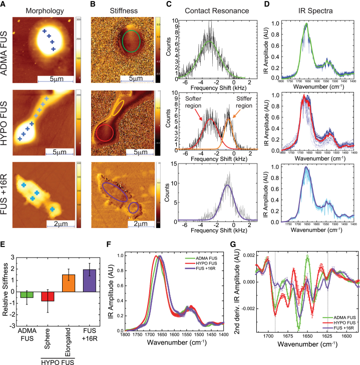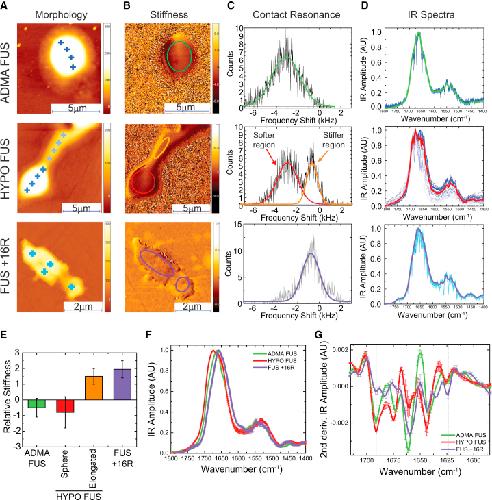 Figure 6. Nanoscale Resolution Analysis of the Mechanical and Secondary and Quaternary Structural Properties of Individual FUS Condensates Reveal Substantial Differences between ADMA FUS versus HYPO FUS and Cation-Ï-Enhanced FUS CondensatesFor a Figure360 author presentation of Figure 6, see the figure legend at https://doi.org/10.1016/j.cell.2018.03.056.(A) Representative AFM 3D morphology maps of individual ADMA FUS (top), HYPO FUS (center), and FUS +16R granules (bottom). Crosses represent position of nanoscale localized IR spectroscopy measurements.(B) Representative tip-sample contact resonance maps of nanoscale stiffness for ADMA FUS (top), HYPO FUS (middle), and cation-Ï enhanced FUS +16R condensates (bottom). Colored circles indicate where contact resonance shift was evaluated.(C) Histogram of tip-sample contact resonance shift (âstiffnessâ) for representative ADMA FUS (top), HYPO FUS (middle), and FUS +16R (bottom) condensates. ADMA FUS and FUS +16R condensates have homogeneous (but different) nanomechanical properties. HYPO FUS condensates are heterogeneous, with softer and stiffer regions. The colored average curves correspond to the distribution of contact resonance shifts in the colored regions in (B).(D) Individual nanoscale raw localized spectra and their average (bold) from locations indicated by â+â on AFM maps for corresponding ADMA FUS (top), HYPO FUS (center), and FUS+16R (bottom) condensates. n = 3 independent methylated ADMA FUS assemblies; n = 4 independent hypomethylated FUS assemblies; n = 4 for the FUS +16R assemblies. Error bars, SEM.(E) Relative stiffness of the FUS assemblies. ADMA FUS (green) and round HYPO FUS (red) display soft nanomechanical properties. The non-spherical HYPO FUS and FUS+16R, display stiffer properties. n ⥠3 independent ADMA FUS; HYPO FUS; FUS +16R condensates. Error bars, SD.(F) Average IR spectra in amide band I and II for ADMA, HYPO, and FUS +16R, which derive from the average of the average of 55 ADMA FUS, 73 HYPO FUS, and 88 FUS +16R spectra. Error bars, SEM.(G) Deconvolution of amide band I reveals that (1) HYPO FUS droplets (red line) have a significant increase of antiparallel β sheet, random coil and β-turn structures, compared to the ADMA FUS droplets (green line). (2) FUS +16R assemblies (purple line) are stabilized by parallel amyloidogenic β sheet content (1,625 cmâ1). Error bars, SEM.See also Figure S6.Figure360: An Author Presentation of Figure 6 |