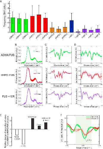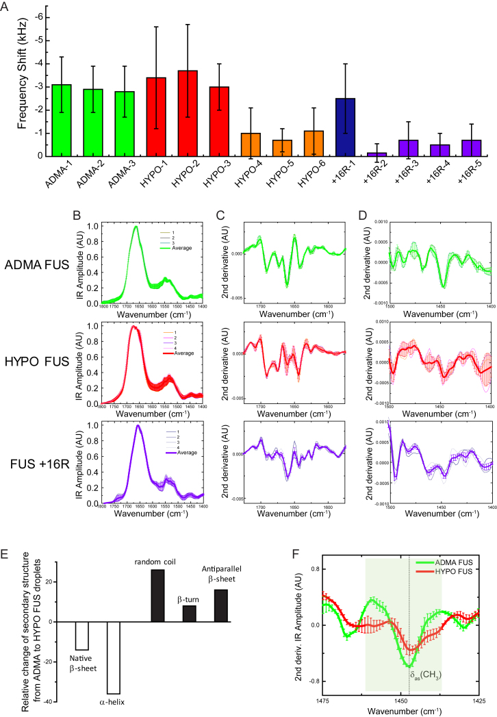 Figure S6. Nanoscale Infrared Spectroscopy Reveals that ADMA, HYPO FUS, and FUS+16R Assemblies Display Different Stiffness and Secondary and Quaternary Organization, Related to Figure 6(A) AFM tip-sample Contact Frequency measurements of ADMA and HYPO FUS assemblies. The average frequency shift for 3 different ADMA-FUS droplets (green), for 6 regions within 4 different HYPO FUS droplets (red and orange) and 5 regions within 4 FUS +16R droplets, with the relative standard deviation.(B) Average IR spectrum of each measured ADMA, HYPO and FUS +16R granules and their average.(C and D) Second derivatives of IR spectra at specific wavenumbers of each individual ADMA, HYPO and FUS+16R granules and their average. We acquired a total of 55, 73, 88 spectra for the WT, HYPO and +16R droplets, respectively. ADMA and +16R droplets show higher degrees of homogeneity than HYPO ones, which show higher structural heterogeneity.(E) The relative conformational change between ADMA and HYPO -FUS assemblies is displayed as histograms, and shows increased random coil, β-turn and antiparallel β sheet content (black bars), and decreased native β sheet and α-helical content (white bars) in HYPO FUS assemblies.(D) HYPO FUS assemblies show lower and shifted signals of methyl group absorption (δas(CH3), methyl asymmetric stretching), confirming a lower methylation state of HYPO FUS assemblies. Error bars = SEM. |