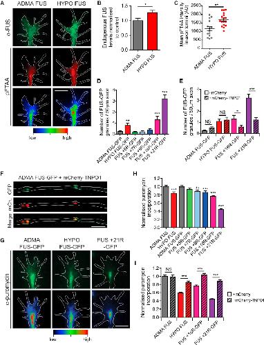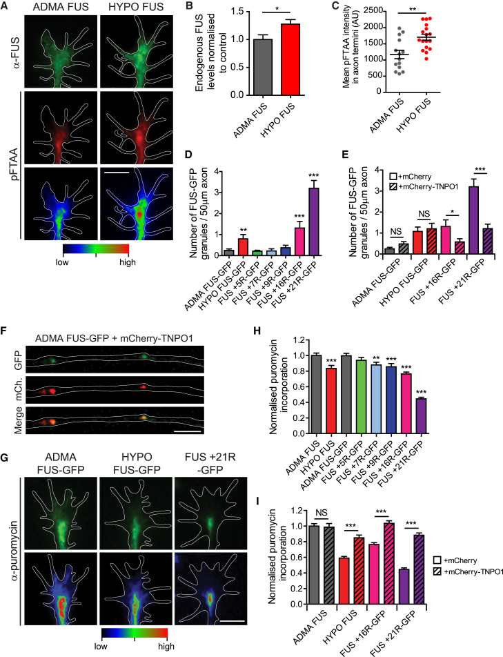 Figure 7. Hypomethylation of FUS or FUS Constructs with Additional Arginines Promote FUS Granule Formation and Attenuate Axonal New Protein Synthesis, which Is Rescued by TNPO1For a Figure360 author presentation of Figure 7, see the figure legend at https://doi.org/10.1016/j.cell.2018.03.056.(A) Representative images of endogenous FUS (anti-FUS antibody, green) and pFTAA binding (red and heatmaps) in fixed axon terminals, showing AdOx-induced increased FUS aggregates and pFTAA binding (right). Scale bar, 5 μm.(B) Quantification of the increased accumulation of endogenous FUS granules following AdOx treatment of the axon terminals in (A). The accumulation of FUS granules was assessed by FUS immunofluorescence. Unpaired t test, n = 26 and 16 axon terminals. âp < 0.05, ââp < 0.01. Error bars, SEM.(C) Quantification of the change in phase state of endogenous FUS granules following AdOx treatment of the axon terminals in (A). Phase state was assessed using pFTAA fluorescence intensity. Unpaired t test, n = 26 and 16 axon terminals, âp < 0.05, ââp < 0.01.(D) AdOx treatment (HYPO FUS) or expression of FUS with additional arginines increases FUS granules in live distal axon segments. Unpaired t test, n = 20â30 axon segments, ââp < 0.01, âââp < 0.001. Error bars, SEM.(E) Number of FUS-GFP granules per 50 μm live distal axon segments following mock or AdOx treatment, or expressing FUS with additional arginines, and co-expressing mCherry or mCherry-TNPO1. Unpaired t test, n = 20â30 axon segments, ns, not significant, âp < 0.05, âââp < 0.001. Error bars, SEM. Video S3 displays movement of TNPO1 (red) in FUS granules in the axon shaft of neurons expressing ADMA FUS.(F) Representative images showing colocalization of FUS and TNPO1 in distal axons. Scale bar, 5 μm.(G) Representative images (pseudo-colored green) and heatmaps of puromycin-labeled newly synthesized proteins in mock-treated (ADMA FUS, left), AdOx-treated (HYPO FUS, middle), or FUS +21R-GFP-expressing axon terminals (FUS +21R, right). Scale bar, 5 μm.(H) Quantification of (G). Unpaired t test, n > 100 axon terminals. ns, not significant. ââp < 0.01, âââp < 0.001. Error bars, SEM.(I) Coexpression of mCherry-TNPO1 rescues new protein synthesis in AdOx-treated neurons and neurons expressing FUS with additional arginines. Unpaired t test, n > 100 axon terminals, ns, not significant, âââp < 0.001. Error bars, SEM.See also Video S3.Figure360: An Author Presentation of Figure 7 |