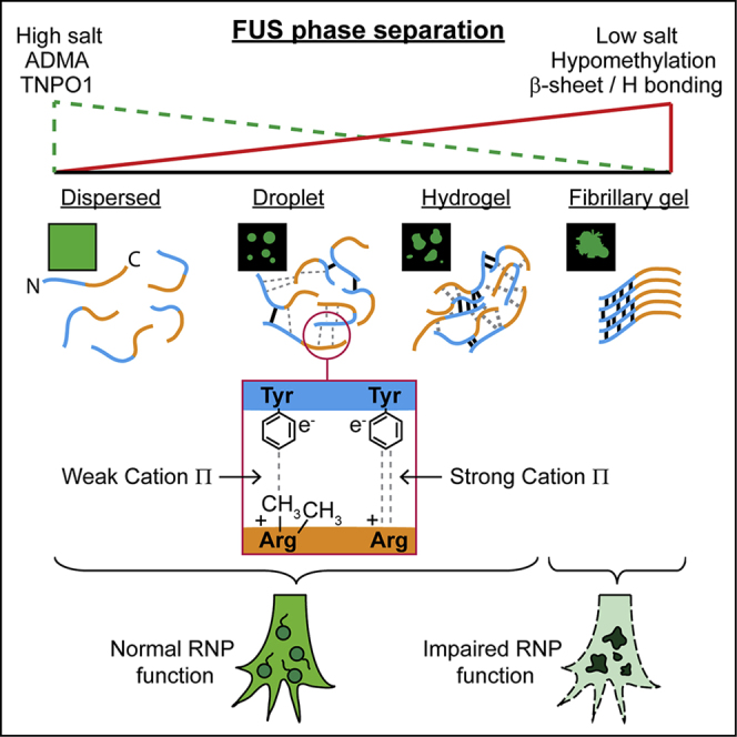 Reversible phase separation underpins the role of FUS in ribonucleoprotein granules and other membrane-free organelles and is, in part, driven by the intrinsically disordered low-complexity (LC) domain of FUS. Here, we report that cooperative cation-π interactions between tyrosines in the LC domain and arginines in structured C-terminal domains also contribute to phase separation. These interactions are modulated by post-translational arginine methylation, wherein arginine hypomethylation strongly promotes phase separation and gelation. Indeed, significant hypomethylation, which occurs in FUS-associated frontotemporal lobar degeneration (FTLD), induces FUS condensation into stable intermolecular β-sheet-rich hydrogels that disrupt RNP granule function and impair new protein synthesis in neuron terminals. We show that transportin acts as a physiological molecular chaperone of FUS in neuron terminals, reducing phase separation and gelation of methylated and hypomethylated FUS and rescuing protein synthesis. These results demonstrate how FUS condensation is physiologically regulated and how perturbations in these mechanisms can lead to disease.