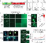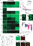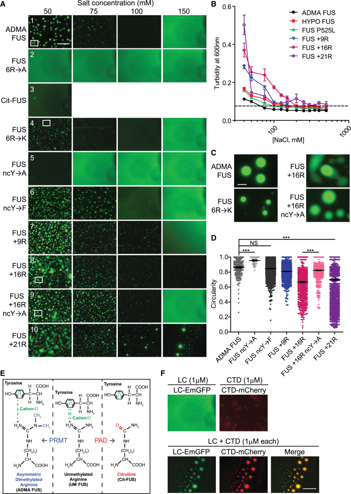 Figure 2. Phase Separation Is Driven by Cation-Ï Interactions between Arginines in RGG Motifs in the Structured C-Terminal Domain and Tyrosines near the Core of the LC Domain (ncY)For a Figure360 author presentation of Figure 2, see the figure legend at https://doi.org/10.1016/j.cell.2018.03.056.(A) The strength of cation-Ï interactions can be modulated by varying the number of arginine residues or by varying the number of tyrosine residues. Row 1: Representative images of phase separation by EmGFP-tagged ADMA FUS in 50 â150 mM NaCl. Row 2: Mutating arginines 216, 259, 407, 472, 473, and 476 to alanine (6RâA) abrogates phase separation. Row 3: Enzymatic conversion of arginines to citrullines abrogates phase separation. Row 4: Mutation of these arginines to lysine (6RâK) preserves phase separation. Row 5: Mutating ncYs 113, 122, 130, 136, 143, 149, 161 to alanine (ncYâA) reduces phase separation. Row 6: Mutating the same tyrosines to phenylalanine (ncYâF) preserves phase separation. Rows 7, 8, and 10: Addition of arginine residues (FUS +9R, FUS +16R, FUS +21R) permits phase separation at higher salt concentrations. Row 9: Adding ncYâA to FUS +16R (FUS +16R ncYâA) rescues phase separation (150 mM). Scale bar, 25 μm.(B) Phase separation/turbidity diagram for constructs in (A). Error bars, SEM; n ⥠3 replications.(C) Representative images of highly spherical ADMA FUS and FUS 6RâK assemblies. The nonspherical FUS +16R droplets can be rescued by FUS +16R ncYâA mutations.(D) Circularity (sphericity) graph: ADMA FUS are spherical. Replacing ncYs with alanine (ncYâA) increases circularity, likely because there is reduced progression to gelation (Studentâs t test, Satterthwaite method for unequal variances: t = 7.46, degrees of freedom [df] = 155, p = 5.91 à 10â12). Replacing ncYs with phenylalanine (ncYâF) supports normal phase separation (t = 1.69, df = 213, p = 0.092). Augmenting cation-Ï interactions increases gelation and reduces circularity (i.e., FUS +9R, FUS +16R, FUS +21R) (Student-Newman-Keuls multiple comparisons of means test: F = 64.57[6, 6674], p = 2.84 à 10â78). Decreasing the augmented cation-Ï drive in FUS +16R by reducing the available near-core tyrosines (FUS +16R ncYâA) restores normal phase separation and circularity (FUS +16R-ncYâA vs. FUS+16R: t = 16.84, df = 987, p = 3.97 à 10â56); FUS +16R-ncYâA versus ADAM FUS: t = 3.98, df = 257, p = 8.98x10â5). N > 3 independent replications. Error bars, SEM.(E) Schematics of PRMT-mediated dimethylation of arginine to create ADMA FUS; PAD-mediated conversion of arginine to citrulline; and cation-Ï interactions between tyrosine rings and arginine guanidino side chain.(F) Tyrosine-rich LC domain and arginine-rich sCTD cooperatively support phase separation. Top row: representative images of EmGFP-LC domain (aa 1â214) alone (left) and mCherry-CTD (aa 215â526) alone (right) at 1 μM FUS, 50 mM NaCl, showing minimal phase separation. Bottom row: brief (<2 min) phase separation occurs upon mixing LC domain (green) with sCTD (red). Merged (orange). Scale bar, 25 μm.See also Figure S2.Figure360: An Author Presentation of Figure 2 |
