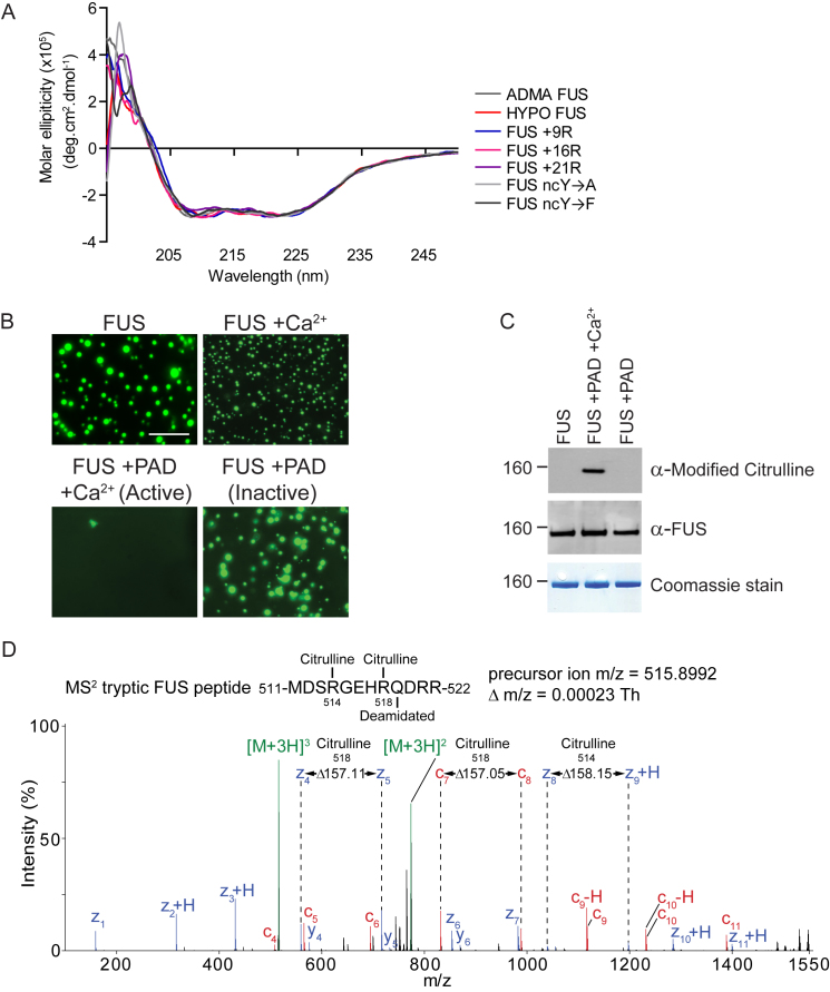 Figure S2. Hypomethylated FUS and FUS with Additional Arginines Have CD Spectra, Are Indistinguishable from ADMA Citrullination of FUS, and so Are Likely to Be Properly Folded; Protein Arginine Deiminase Treatment Converts Arginines to Citrulline, Related to Figure 2(A) Circular dichroism (CD) spectrum of ADMA FUS, Hypo-FUS, 9R, 16R, 21R, ncYâA, ncYâF were measured on a JASCO-810 Spectropolarimeter at 25°C. 5μM of each purified protein was placed in a 1 mm path length quartz cuvette and the far-UV spectrum recorded in the wavelength range of 195 â 250 nm. Scans were repeated ten times and then averaged to yield a final spectrum for each construct.(B) At 1μM FUS and 50 mM NaCl, FUS undergoes phase transition. Upon addition of active PAD (in presence of calcium) phase transition is abrogated.(C) Representative western blots showing: top panel: anti-modified citrulline antibody detects a band in FUS + active PAD sample. Middle panel: equal FUS protein loading is detects by anti-FUS antibody. Bottom panel: Coomassie staining also detects equal FUS protein loading in each sample.(D) Orbitrap ETD MS2 spectrum of a tryptic FUS peptide citrullinated at R514 and R518 identified with confidence exceeding 99% from a PAD treated FUS preparation. |