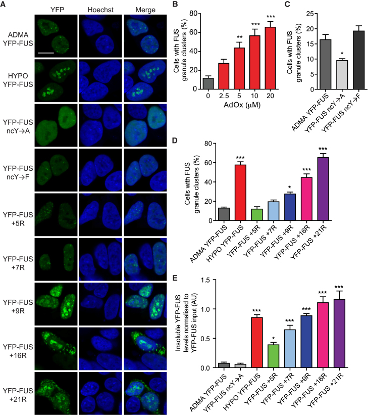 Figure 3. FUS Phase Separation in SH-SY5Y Cells Is Modulated by FUS Methylation, by the Number of Tyrosines near the LC Core (ncY), and Number of Arginines in the sCTDFor a Figure360 author presentation of Figure 3, see the figure legend at https://doi.org/10.1016/j.cell.2018.03.056.(A) Representative images of FUS granules in SH-SY5Y cells expressing either YFP-tagged FUS, with or without AdOx treatment (HYPO or ADMA FUS respectively), or FUS with variations in the number of tyrosines or arginine. More cells had granules after AdOx treatment (HYPO FUS) and after expressing FUS with additional arginines (e.g., FUS +9R etc). Fewer cells had FUS granules after expressing FUS with tyrosines converted to alanine (ncYâA). Cells with tyrosines converted to phenylalanine (ncYâF) had normal granule formation. Scale bar, 10 μm.(B) AdOx causes a dose-dependent increase in cells with FUS granules. n = 100â200 cells/replicate experiment. Mean ± SEM, n = 5 replicates ââp < 0.01, âââp < 0.001, one-way ANOVA with Dunnettâs post hoc test.(C) Quantification of the number of cells in (A) with clusters of condensed FUS granules, comparing cells expressing wild-type FUS versus cells expressing FUS in which tyrosine residues in the N-terminal LC domain are mutated to alanine (inhibits cation-Ï interactions) or mutated to phenylalanine (maintains cation-Ï interactions). n > 200 cells/replicate. One-way ANOVA with Dunnett post hoc test, n = 3â7 independent replications, âp < 0.05, âââp < 0.001. Error bars, SEM.(D) Quantification of the number of cells in (A) with clusters of condensed FUS granules, comparing cells expressing wild-type FUS versus cells expressing FUS with increasing numbers of additional arginine residues in the structured C-terminal domain. n > 200 cells/replicate. One-way ANOVA with Dunnett post hoc test, n = 3â7 independent replications, âp < 0.05, âââp < 0.001. Error bars, SEM(E) Quantification of RIPA-insoluble FUS, normalized to input, in cells expressing ADMA FUS, HYPO FUS, FUS ncYâA, or FUS with additional arginines. One-way ANOVA with Dunnettâs post hoc test, n = 4, âp < 0.05, âââp < 0.001. Error bars, SEM.See also Figure S3.Figure360: An Author Presentation of Figure 3 |