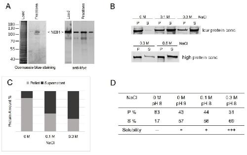 Figure 5. Formation of HisMyc-NE81ΔNLSΔCLIM assemblies is salt-dependent in vitro. (A) Affinity purification of HisMyc-NE81ΔNLSΔCLIM expressed in Dictyostelium at high-salt conditions (0.5 M NaCl). Proteins were separated on an 8% SDS-PAGE. A Coomassie blue staining (left) and a Western blot stained with anti-Myc/alkaline phosphatase and NBT/BCIP color detection of the total extract and Ni-NTA-chromatography fractions are shown. Molecular masses of standard proteins are indicated on the left. (B) Soluble purified HisMyc-NE81ΔNLSΔCLIM at two starting concentrations (low concentration = 0.2 mg/mL; high concentration = 0.4 mg/mL) was dialyzed against 25 mM Tris-HCl pH = 8.0 and indicated NaCl concentrations, followed by centrifugation. Equivalent amounts of pellet (P) and supernatant (S) were loaded on SDS gels, blotted, stained with anti-myc antibodies, and detected as described above. Low concentration: protein amount in the pellet decreases with increasing NaCl concentration. (C) Chart depicting densitometric percentages of HisMyc-NE81ΔNLSΔCLIM in supernatants and pellets obtained at the indicated salt conditions (low protein concentration = 0.2 mg/mL protein). (D) Percentages of HisMyc-NE81ΔNLSΔCLIM in supernatants and pellets obtained at the indicated salt and pH conditions (low protein concentration = 0.2 mg/mL protein). Key: +++ most protein in supernatant, + around half of protein in supernatant, -- most of protein in pellet.