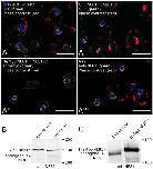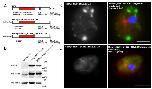 Figure 3. Expression of tagged NE81 in AX2 control cells or NE81 knockout cells. (A) Fluorescence deconvolution microscopy using a PlanApo 1.4/100× objective; GFP-NE81 cells (A), GFP-NE81KO cells (A′), HisMyc-NE81KO cells (A′′), and AX2 control cells (A′′′) were fixed with glutaraldehyde, stained with 4′,6-diamidino-2-phenylindole (DAPI) and, if appropriate (A′′′), with anti-Myc/anti-mouse-AlexaFluor 488 or anti-NE81/anti-rabbit-AlexaFluor 488. Scale bar = 5 µm. NE81 fluorescence is shown in green, DAPI in blue, and inverted phase contrast emphasizing the dark nucleoli is shown in red. (B,C) Immunoblots stained with alkaline phosphatase/NBT/BCIP show the absence of endogenous NE81 in the respective knockout (KO) strains and the band shift of the tagged protein compared to endogenous NE81.