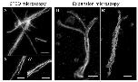 Figure 7. Super-resolution fluorescence microscopy of HisMyc-NE81ΔNLSΔCLIM filaments. (A–A′′) stimulated emission depletion (STED) microscopy: assemblies formed at low protein concentration (5 µg/mL) were stained with anti-NE81/anti-rabbit-Atto 647N. Scale bars = 1 µm. (B,B′) Expansion microscopy with deconvolution, 3.5-fold expanded; assemblies formed at 0.3 mg/mL (B) and 5 µg/mL (B′) were stained with anti-NE81/anti-rabbit-AlexaFluor 488. Maximum-intensity projections are presented. Refer to supplemental videos 1 and 2 to get a three-dimensional impression. The scale bar (2 µm) refers to the original size of the specimen.