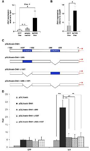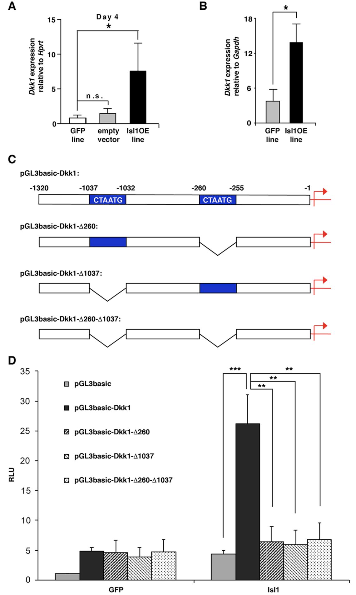 Fig. 1. Isl1 positively regulates Dkk1 expression. A, B. Isl1OE ES line at day 4 of cardiac differentiation (A) and Isl1-overexpressing endodermal NFPE cells (B) show increased Dkk1 expression as determined by real-time RT-PCR. Dkk1 gene expression levels were normalized to Hprt (A) or Gapdh (B); n = 3. C. Schematic representation of the 1.3 kb promoter region upstream of the Dkk1 transcription site containing two predicted Isl1-binding sites. Deletion constructs generated are given. D. Bar graph illustrating the luciferase activity. NFPE cells were transiently transfected with a pGL3-basic luciferase reporter or with the same vector encompassing the 1.3 kb Dkk1 promoter fragment, together with an expression vector containing GFP control or Isl1. In addition, modified pGL3-basic-Dkk1-promoter constructs were used, in which either one or both Isl1-binding sites were deleted. The luciferase levels were normalized for the β-galactosidase activity of a co-transfected RSV-βGal and shown as luciferase activity relative to pGL3-basic plus GFP control (RLU, relative light units). n = 6–8. For all panels: Mean values with standard errors are given. *p < 0.05, **p < 0.01 and ***p < 0.001 with Student’ T-test. |
