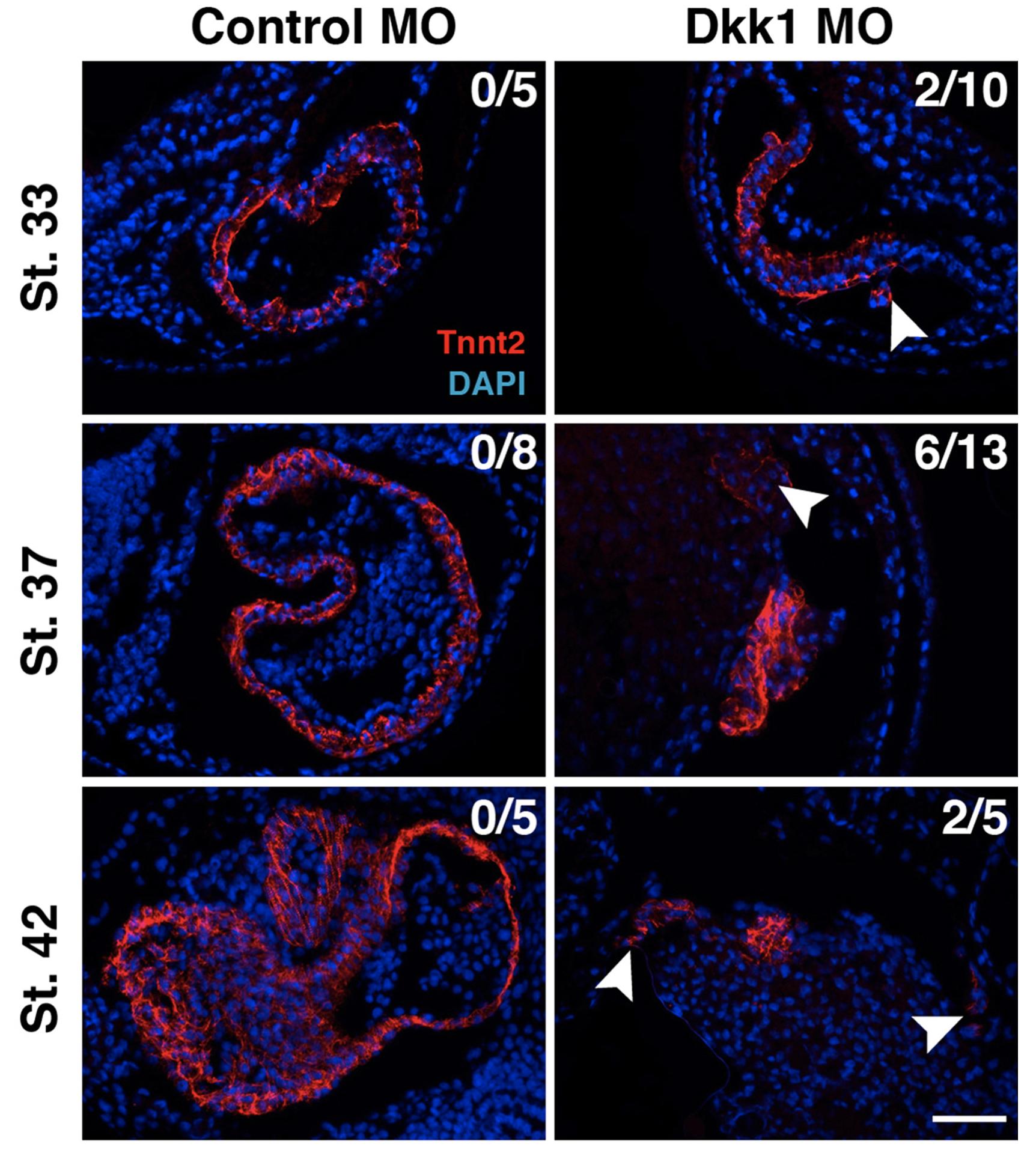 Fig. 9. Cardiomyocytes detach from the myocardium upon loss of Dkk1. Sections of embryos are shown stained for cardiac troponin T (red) to label cardiomyocytes and counterstained with DAPI (blue) to highlight nuclei at the stages indicated. Upon loss of Dkk1 ectopic troponin T positive cells (white arrowheads) were found in the indicated number of cases. Embryos shown are the same as analyzed in Fig. 4. Scale bar, 100â¯Î¼m. |