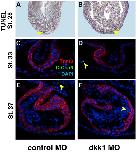 Supplement Fig. 3: Loss of Dkk1 does not result in apoptosis A,B. Apoptotic cells were stained at stage 28 by TUNEL assay. Only few apoptotic cells were detected on sections as indicated by the yellow arrowhead. No difference between Control MO and Dkk1 MO injected embryos was observed. C-F. Apoptotic cells were detected by immunofluorescence staining against cleaved caspase 3 (C-Csp3) followed by serial sections. Cardiomyocytes were detected by cardiac troponin T staining (Tnnt2). Nuclei were counterstained with DAPI. Only few apoptotic cells were detected at stage 33 (C,D) or 37 (E,F) as labelled by the yellow arrowhead. Scale bar, 100 µm. |