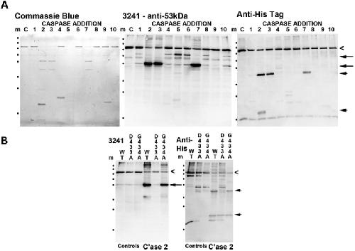 Fig. 2. Characterization of the caspase sensitivity of BFSP1.A. In vitro cleavage of BFSP1 by purified caspases 1â10. Full length recombinant BFSP1 containing a C-terminal polyhistidine tag is indicated (chevron). Using the polyclonal antibody 3241 that was raised against the bovine 53 kDa fragment of BFSP1, two major fragments were detected (arrows). One corresponded to the 53 kDa fragment and like the slower migrating band of the two, both were undetected by the His-tag directed antibodies. Therefore both these fragments likely lack different proportions of the C-terminal sequences. Using the anti-His tag antibodies, two prominent bands were detected in the caspase 2 treated BFSP1 sample (arrowheads). Neither of these bands comigrated with bands detected by the 3241 polyclonal antibodies. B. To evidence cleavage of BFSP1 by caspase 2 at the D433 and D549 sites, two BFSP1 mutants were produced, D433A and D549A. Comparing WT, D433A and D549A BFSP1 sensitivity to caspase 2 cleavage resulted in the absence of the characteristic 53 kDa fragment (arrowhead) in the G433A BFSP1 as detected by the 3241 polyclonal antibodies. Using the anti-His tag antibodies, two characteristic fragments (arrowheads) were detected in the wild type and D549A BFSP1 samples, but only the faster migrating band in the D433A BFSP1 sample. Similarly the bands indicated (Asterisks) were present in the WT and D433A BFSP1 samples but missing from the D549A BFSP1 sample. This indicates that the mutations have abolished one site at position D433 and one at D549 for caspase 2. |