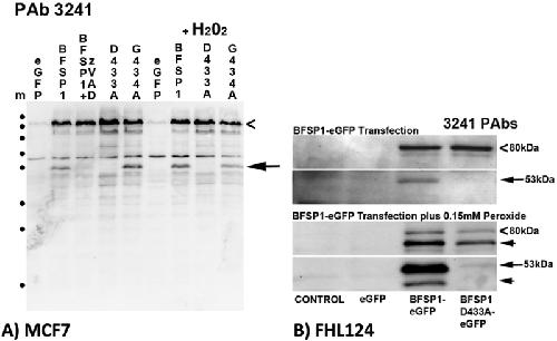 Fig. 3. Caspase sensitivity of transfected BFSP1 in MCF7 and FHL124 cells.MCF7 and FHL124 cells were transiently transfected with constructs encoding eGFP alone, or as a N-terminal fusion with human BFSP1, and the mutants G433A (MCF7 and FHL124) and G434A BFSP1 (MCF7 only). Transfected BFSP1 was detected using the polyclonal antibodies 3241. A. MCF7 cells were either untreated or treated with the generic caspase inhibitor (zVAD) or with 0.15 M H202 in order to induce effector caspases. Full length eGFP-BFSP1 is indicated (chevron). A 53 kDa fragment (arrow) was detected by the 3241 antibodies. Note the absence of the 53 kDa signal in cells transfected with D433A, but not the G434A BFSP1 construct. The caspase inhibitor also prevented the formation of this fragment. B. The D433A mutation blocks the caspase sensitivity of BFSP1 constructs transiently transfected into the human lens epithelial cell line FHL124. The BFSP1 sequence 1â460 was fused to the N-terminus of eGFP and transiently transfected into FHL124 cells resulting in an 80 kDa product (chevrons). Notice the major breakdown product (53 kDa) for the construct containing the wild type D433 residue and the very significant reduction when this was replaced by A433. Slower migrating products (arrowheads) could arise by caspase cleavage either within the BFSP1 or eGFP parts of the fusion protein. Marker proteins (m) are indicated (â¢) and correspond to 250, 130, 100, 70, 55, 35, 25 and 15 kDa as per PageRuler prestained standards. |