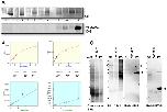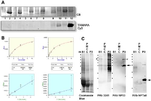 Fig. 4. In vivo Myristoylation assay of truncated Tail fragment of BFSP1:A: Truncated Tail fragment of BFSP1 was co-expressed with CaNMT in E. coli in the presence of azido-myristate. CLICK-chemistry was used to detect myristolyated proteins and detected in the gel after fluorescently labelled with Cy3-TAMRA. PfARF1 (Plasmodium falciparum ADP-ribosylation factor-1) was included as a positive control of myristoylation. Track1 and 2, Pre- and post-induction of PfARF expression in E.coli; Tracks 3 and 4, Pre- and post-induction of PfARF with C.albicans NMT expression in E.coli; Tracks 5 and 6: Pre- and post-induction of G434-P548 BFSP1 expression in E.coli; Tracks 7 and 8, Pre- and post-induction of BFSP1 G434-P548 with C.albicans NMT expression in E.coli; Tracks 9 and 10, Pre- and post-induction of PfARF with C.albicans NMT expression in E.coli fed with azido-myristate followed by CLICK chemistry detection; Tracks 11 and 12, Pre- and post-induction of BFSP1 G434-P548 with C.albicans NMT expression in E.coli fed with azidomyristate followed by CLICK chemistry detection. Notice the positive bands in tracks 10 and 12 only. B. Km and Vmax determination for recombinant human NMT1 and 2 for the BFSP1 sequence G434- F441. C. Characterization of the polyclonal antibodies NP-Tail and NP53 using human lens samples. The soluble protein fraction (S1), the plasma membrane cytoskeleton complex (PMCC) and plasma membrane fraction (P3) were isolated from the human cortex and separated by SDS PAGE and the 10% (w/v) polyacrylamide gel prior to either staining with Coomassie Blue or immunoblotting and probing with the polyclonal antibodies 3241, NP-53 and NP-Tail. Notice that the major immunoreactive band detected in the P3 sample by the NP-tail antibodies would correspond to a C-terminal fragment of less than 25 kDa. Marker proteins (m) are indicated (â¢) and correspond to 250, 130, 100, 70, 55, 35, 25 and 15 kDa as per PageRuler prestained standards. |