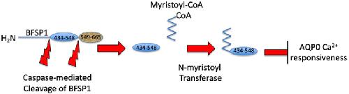Fig. 7. AQP0 activity is differentially modulated by BFSP1 and its post-translationally modified fragments.Full length human BFSP1 is cleaved by caspases at sites 433 and 549. The 433 site reveals a cryptic myristoylation site. The lens expresses both NMT1 and NMT2. The 434â549 and 434â665 fragments, once myristoylated, can effectively eliminate the regulation of AQP0 Pf by Ca2+. Preventing myristoylation restores the Ca2+ regulation of AQP0 Pf (right hand side of the figure). |