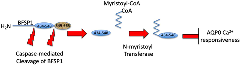BFSP1 (beaded filament structural protein 1, filensin) is a cytoskeletal protein expressed in the eye lens. It binds AQP0 in vitro and its C-terminal sequences have been suggested to regulate the water channel activity of AQP0. A myristoylated fragment from the C-terminus of BFSP1 was found in AQP0 enriched fractions. Here we identify BFSP1 as a substrate for caspase-mediated cleavage at several C-terminal sites including D433. Cleavage at D433 exposes a cryptic myristoylation sequence (434-440). We confirm that this sequence is an excellent substrate for both NMT1 and 2 (N-myristoyl transferase). Thus caspase cleavage may promote formation of myristoylated fragments derived from the BFSP1 C-terminus (G434-S665). Myristoylation at G434 is not required for membrane association. Biochemical fractionation and immunogold labeling confirmed that C-terminal BFSP1 fragments containing the myristoylation sequence colocalized with AQP0 in the same plasma membrane compartments of lens fibre cells. To determine the functional significance of the association of BFSP1 G434-S665 sequences with AQP0, we measured AQP0 water permeability in Xenopus oocytes co-transfected with transcripts expressing both AQP0 and various C-terminal domain fragments of BFSP1 generated by caspase cleavage. We found that different fragments dramatically alter the response of AQP0 to different concentrations of Ca2+. The complete C-terminal fragment (G434-S665) eliminates calcium regulation altogether. Shorter fragments can enhance regulation by elevated calcium or reverse the response, indicative of the regulatory potential of BFSP1 with respect to AQP0. In particular, elimination of the myristoylation site by the mutation G434A reverses the order of water permeability sensitivity to different Ca2+ concentrations.