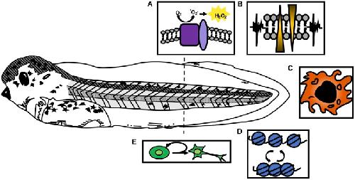 FIGURE 1. Cellular processes activated by injury in Xenopus tail regeneration. A regenerative stage 41 tadpole is shown, prior to the onset of independent feeding and the refractory period. Responses to injury that are critical for regeneration include (A) formation of reactive oxygen species such as H2O2 through the action of NOX complexes (purple) and p22-phox/cyba (light purple); (B) bioelectrical signaling mediated by ion channel activation; (C) recruitment of innate immune cell types such as macrophages; (D) epigenetic modifications that affect chromatin accessibility and transcription, and (E) activation of proliferation of blastemal cells and tissue-specific progenitors. |