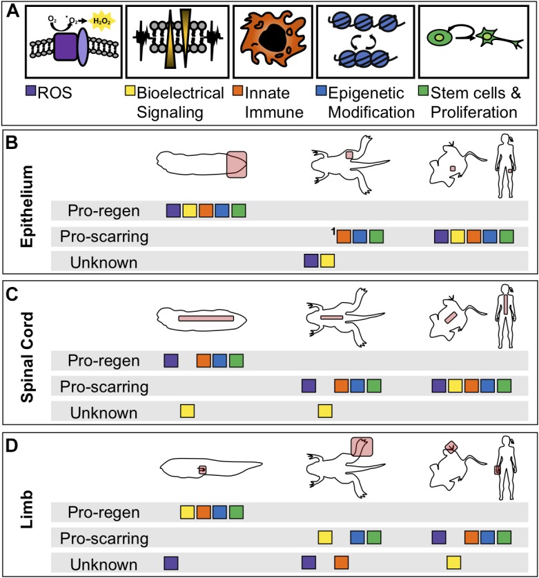 FIGURE 3. Comparison of physiological phenomena during healing between regenerative and non-regenerative organisms. (A) Color coded boxes correspond to either ROS (purple), changes in membrane potential (yellow), innate immune cell recruitment (orange), epigenetic reprogramming (blue), or tissue-specific stem cell proliferation and differentiation (green). (B-D) Summarization of physiological phenomena either known to be associated with regenerative healing, known to be associated with scarring, or not yet studied (unknown) in regenerative and non-regenerative contexts or species. âPro-regenâ refers to epimorphic regeneration as described in this review. âPro-scarringâ refers to injuries that undergo wound healing and scarring. (B) Regeneration or scarring of the epithelium in tadpoles (left), late-metamorphic froglets with minimal regeneration (middle), non-regenerative mammals (right). (C) Regeneration or scarring of the spinal cord. (D) Regeneration or scarring of the amphibian limb and mammalian digit tip. 1In adult frogs and mammals, the epidermal layer regenerates, however, the dermis is replaced by fibrous tissue. |