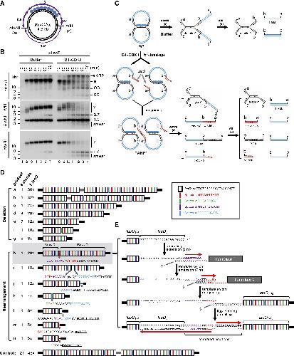 Figure 2. Mitotic Processing of Stalled Replication Forks Leads to Complex DNA Rearrangements (A) Structure of the 4.6-kb p[lacO48] plasmid. Numbers mark the length of the indicated DNA segments in kilobase pairs. (B) p[lacO48] was replicated in the presence of buffer or B1-CDK1. At the indicated time points, replication products were isolated and digested with AlwNI and AflII or AlwNI as indicated. Numbers label the size of linear fragments in kilobase pairs. Y, double-Y or single-Y structure (see C). (C) Model explaining the restriction products observed in (B). Although the model favors fork breakage on the leading strand, the possibility of fork breakage on the lagging strand has not been excluded. A more detailed model is presented in Figure S2A. (D) The smear of â¼3- to 4-kb mitotic DNA replication products generated after AlwNI digestion in (B) was self-ligated, cloned, and sequenced. The controls are replication products of the same plasmid from a mitotic reaction lacking LacR. The lacO repeats, shown as white boxes, are separated by four unique spacers shown in different colors. Inset, DNA sequences of the lacO repeat and four spacers. The detailed structure of the entire lacO array is shown in Figure S2C. (E) A model for the generation of product h in (D) from multiple template-switching events. See also Figure S2. |