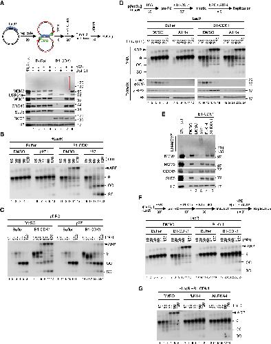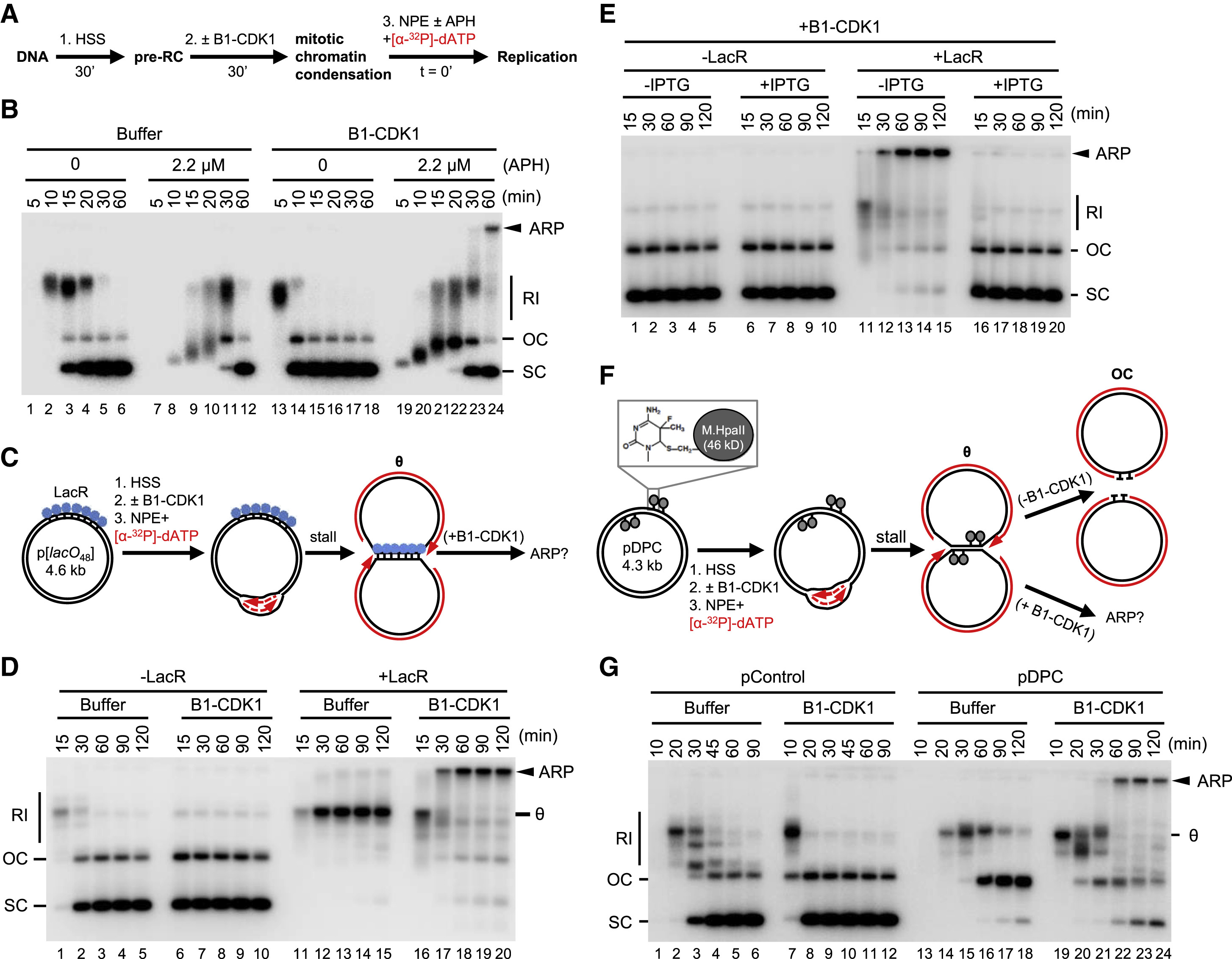 Figure 1. Mitotic CDK Triggers Aberrant Processing of Stalled DNA Replication Forks in Xenopus Egg Extracts (A) Schematic of the experimental approach to test the effect of B1-CDK1 on DNA replication. APH, aphidicolin. (B) A 3-kb pBlueScript plasmid was replicated according to (A), and products were separated on a native agarose gel followed by autoradiography. Unless stated otherwise, the 0 minute time point refers to NPE addition. (C) Schematic of DNA replication for the LacR-bound p[lacO48] plasmid. (D) p[lacO48] was replicated according to (C) under the indicated conditions. (E) p[lacO48] was replicated according to (C) in the absence or presence of LacR and IPTG (10 mM, 15 min incubation in NPE before mixing with the licensing mixture), as indicated. (F) Schematic of replication for pDPC, containing four 46-kDa M.HpaII DNA methyltransferases at the indicated positions. Products formed in the presence and absence of B1-CDK1 are indicated. (G) pControl or pDPC was replicated according to (F) using the indicated conditions. From (A) to (G), B1-CDK1 was added to the licensing mixture at a concentration of 50 ng/μL, and its final concentration in the overall reaction was 16.7 ng/μL (STAR Methods). RI, replication intermediate; OC, open circle; SC, supercoil; θ, theta structure; ARP, aberrant replication product. See also Figure S1. |