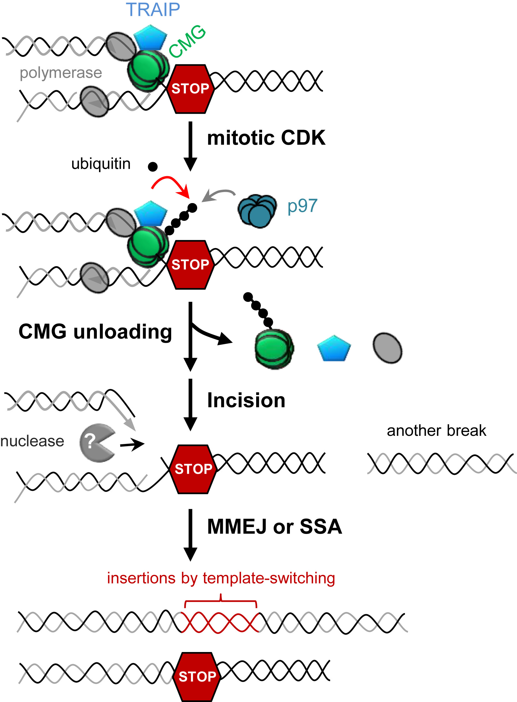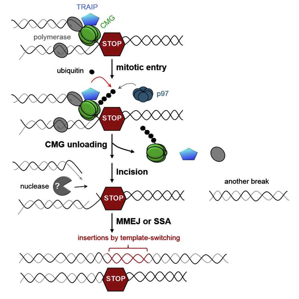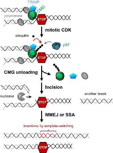 Figure 7. Model of CMG Unloading, Fork Breakage, and Complex DNA Rearrangements upon Premature Mitotic Entry |