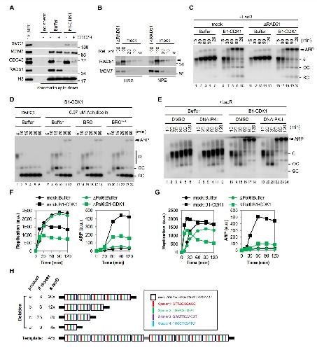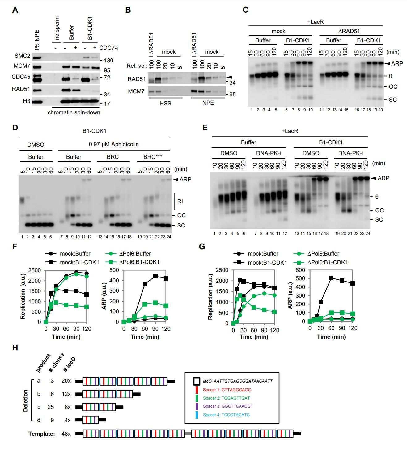 Figure S3, related to Figure 3. (A) B1-CDK1 treatment inhibits chromatin-loading of RAD51. Sperm chromatin was replicated in egg extracts and sampled when 50% replication was completed (20 minutes for Buffer and 9 minutes for B1-CDK1). To inhibit DNA replication, CDC7 inhibitor (CDC7-i, 399 µM of PHA-767491) was added to NPE and incubated for 15 minutes. Chromatin-bound proteins were recovered by chromatin spin-down and detected by blotting with indicated antibodies. (B) Mock-depleted and RAD51-depleted egg extracts were blotted with RAD51 and MCM7 antibodies. Serial dilutions of mock-depletion were used to assess the level of RAD51 depletion. Arrowhead indicates RAD51. (C) LacR-bound p[lacO48] was replicated in mock-depleted or RAD51-depleted egg extracts in the absence or presence of B1-CDK1. (D) pBlueScript was replicated in egg extracts with the indicated treatments. BRC peptide binds and blocks RAD51âs interaction with BRCA2, which prevents HRmediated DSB repair. BRC*** peptide harbors three mutations at RAD51 binding sites and is unable to inhibit RAD51 (Long et al., 2011). (E) LacR-bound p[lacO48] was replicated with the indicated treatments. To inhibit NHEJ, a DNA-PK inhibitor (DNA-PK-i, 133 µM NU-7441) was added to NPE. (F) Quantification of overall DNA replication and ARP for Figure 3B. (G) Quantification of overall DNA replication and ARP for Figure 3C. (H) Structures of clones derived from mitotic ARPs in Polθ-depleted egg extracts (Exp.1 in Figure 3E). In (C-E), ARP, aberrant replication product; θ, theta structure; OC, open circle; SC, supercoil; RI, replication intermediate. |