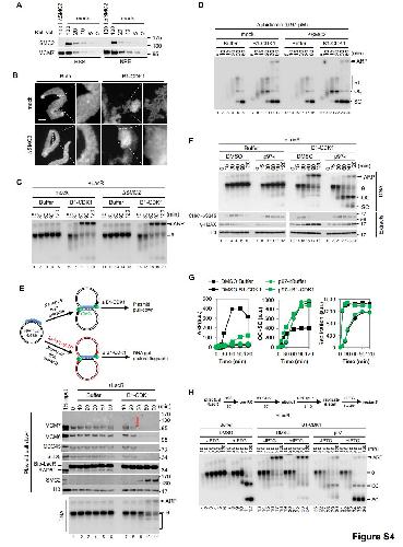 Figure S4, related to Figure 4. (A) Mock-depleted and SMC2-depleted Xenopus egg extracts were blotted for SMC2 and MCM7 alongside a serial dilution of mock-depleted extracts. (B) Effect of SMC2 depletion on B1-CDK1-induced chromatin condensation in HSS. Sperm chromatin was incubated in mock-depleted or SMC2-depleted HSS with Buffer or B1-CDK1 for 30 minutes prior to Hoechst staining and imaging. Regions with boxes were magnified on the right. Note the condensed chromosome in mock-depleted HSS with B1-CDK1 treatment (upper right image). Scale bar, 10 µm. (C) LacR-bound p[lacO48] was replicated in mock-depleted or condensin SMC2-depleted extracts with or without B1-CDK1 treatment.(D) pBlueScript was replicated in mock-depleted or SMC2-depleted egg extracts with a low dose of phidicolin in the absence or presence of B1-CDK1. The absence of SMC2 had no effect on mitotic ARP formation. (E) A time course to relate the timing of CMG unloading to replication fork collapse and ARP formation during replication with B1-CDK1. LacR-bound p[lacO48] was replicated in egg extracts for 30 minutes before the addition of Buffer or B1-CDK1. Plasmid pulldowns were performed from âcoldâ reactions lacking radio-labeled nucleotides in parallel with âhotâ reactions containing [α32P]-dATP. Plasmid pull-down samples were blotted for indicated proteins. Replication products were detected by autoradiography after gel electrophoresis. The red bracket indicates ubiquitylated MCM7, which is detectable before the appearance of the ARP. The black bracket marks potential collapsed replication forks with the B1-CDK1 treatment. (F) Effect of p97 inhibition on stalled replication forks in the presence or absence of B1-CDK1. LacR-bound p[lacO48] plasmid was replicated in âhotâ extracts with [α32P]-dATP to track DNA replication products and in âcoldâ extracts without [α32P]-dATP for plasmid pull-down to track CHK1-S345 phosphorylation (CHK1-pS345), γ-H2AX. Histon H3 was included as loading control. The final concentration of p97-i was 266 μM. (G) Quantification of ARP, OC+SC, and overall DNA replication during replication of pDPC in Figure 4C.(H) Fork restart assay using IPTG to release LacR replication barrier. LacR-bound p[lacO48] was replicated as schemed. The final concentration of IPTG was 10 mM. Note that IPTG had no effect on the B1-CDK1-induced ARP in the presence of DMSO (lanes 13-24), whereas it almost fully restarted DNA synthesis in the presence of p97-i (compare lanes 31-35 with 25-30, and 19-24). In (C) (D), (F) and (H), RI, replication intermediate; ARP, aberrant replication product; OC, open circle; SC, supercoil; θ, theta structure. |