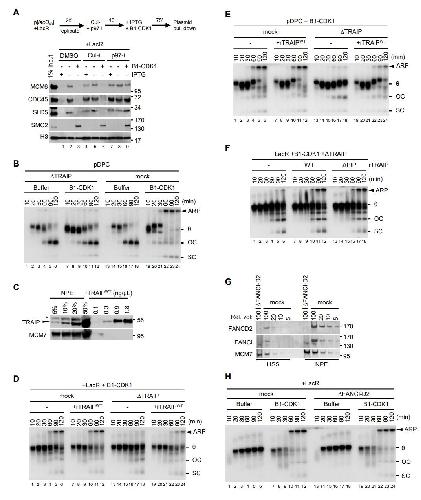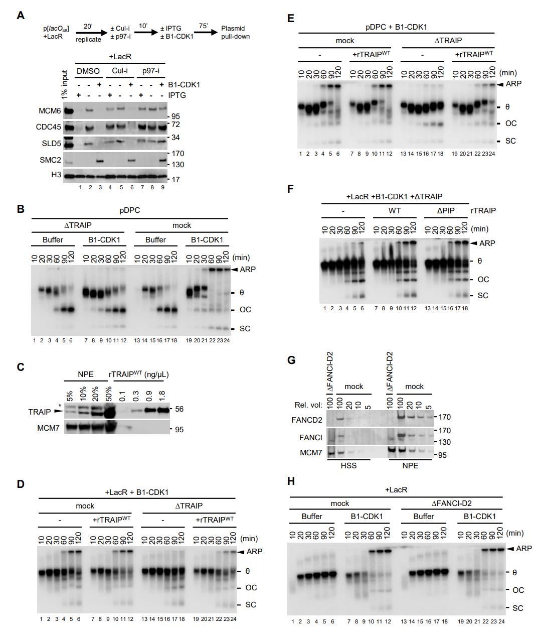 Figure S5, related to Figure 5. (A) LacR-bound p[lacO48] was replicated and treated as schemed. Chromatin-bound proteins were recovered and blotted with the indicated antibodies. IPTG was used to release LacR from lacO array therefore induce replication termination. Cul-i was used to inhibit CRL2Lrr1 -dependent CMG ubiquitylation during interphase replication termination. (B) pDPC was replicated in mock-depleted or TRAIP-depleted egg extracts in the presence or absence of B1-CDK1. (C) Serial dilutions of NPE and rTRAIPWT purified from E. coli were blotted with TRAIP and MCM7 antibodies. Arrowhead marks TRAIP signal and asterisk indicates a background band in NPE. The concentration of TRAIP in NPE is 3.0-4.5 ng/μL. (D-E) LacR-bound p[lacO48] (D) and pDPC (E) were replicated in mitotic mock-depleted or TRAIP-depleted egg extracts with or without rTRAIPWT as indicated. rTRAIPWT was added to NPE at endogenous level (3.6 ng/μL). Matched buffer was added to reactions without rTRAIPWT (F) LacR-bound p[lacO48] was replicated in TRAIP-depleted extracts supplemented with 6xHis-SUMO tagged rTRAIP of wildtype (WT) or truncation of PIP box (ÎPIP), as indicated. Both proteins were added ~5-10 folds of endogenous TRAIP in NPE and incubated for 15 minutes before they were used to drive DNA replication. (G) Mock-depleted and FANCI-D2-double depleted egg extracts were blotted with indicated antibodies. Serial dilution of mock-depleted extract was used to assess the level of FANCI-D2 depletion. (H) LacR-bound p[lacO48] was replicated in mock-depleted or FANCI-D2-depleted egg extracts in the absence or presence of B1-CDK1. The depletion of FANCI-FANCD2 had no effect on ARP formation. In (B), (D), (F) and (H), ARP, aberrant replication product; θ, theta structure; OC, open circle; SC, supercoil. |