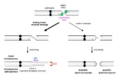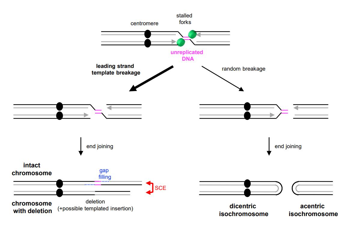 Figure S7. Related to Figure 7 When replication forks stall on either side of a hard-to-replicate region (e.g. a common fragile site), entry into mitosis causes CMG unloading and efficient fork breakage. Because CMG binds the leading strand template, we propose that CMG unloading leads to breakage of both stalled forks on the leading strand templates (left pathway). One intact sister chromatid is rapidly restored by gap filling (dashed blue line). The other chromatid is restored by alternative end joining of the two broken ends, yielding sister chromatid exchange and a deletion that encompasses the segment of unreplicated DNA. Template switching before end joining could generate duplications at the breakpoint. In contrast, if stalled forks are broken randomly (right pathway), unproductive outcomes will be frequent, including the formation of acentric and dicentric isochromosomes (shown). Furthermore, if only one fork is broken, acentric arms can be generated (not shown). |