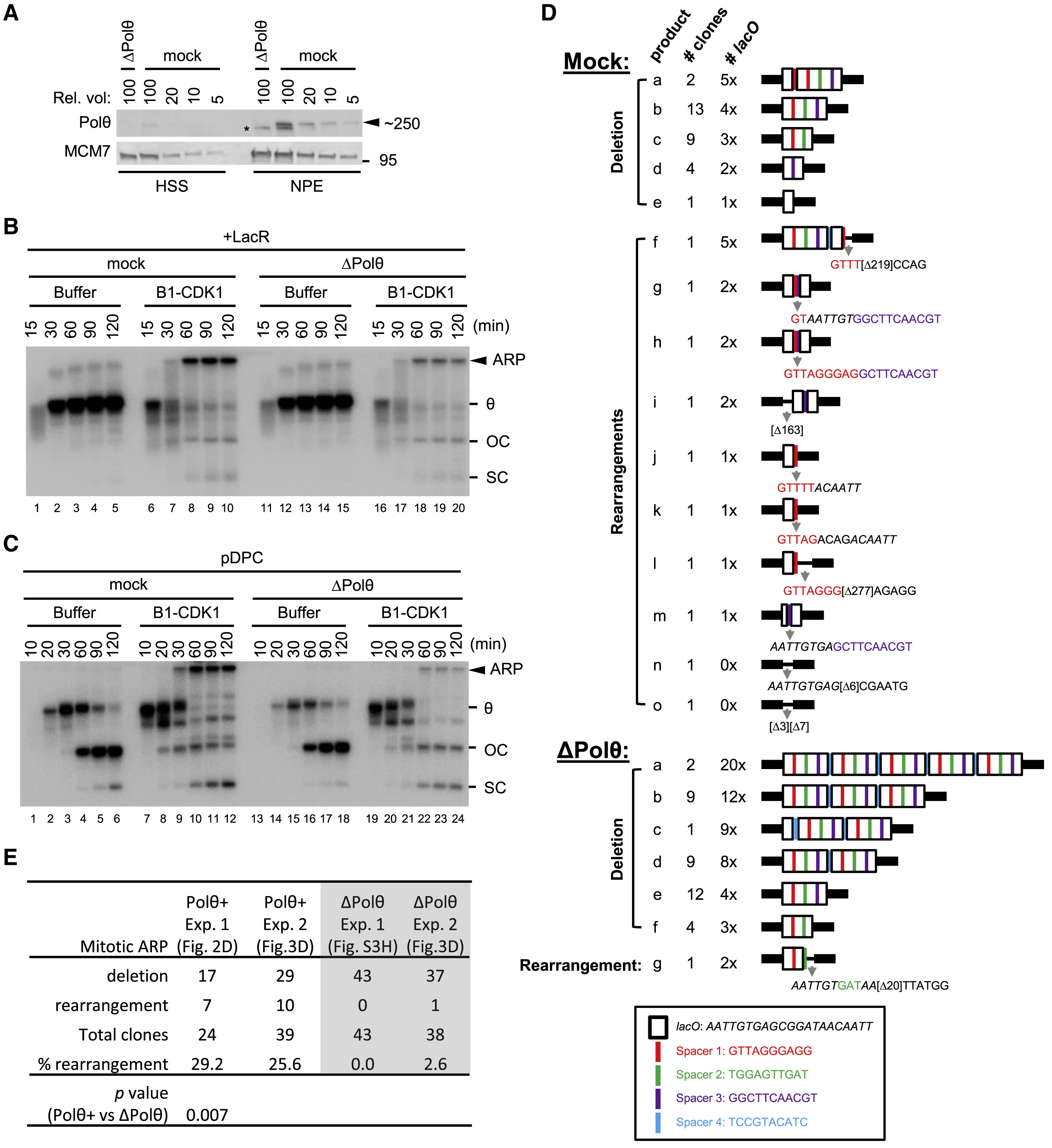 Figure 3. Depletion of DNA Polymerase θ Disrupts the Generation of Aberrant Replication Products in the Presence of Mitotic CDK (A) Mock-depleted and DNA polymerase θ (Polθ-depleted Xenopus egg extracts were blotted for Polθ and MCM7 alongside a serial dilution of mock-depleted extracts. Asterisk, background band. (B) LacR-bound p[lacO48] was replicated in mock-depleted or Polθ-depleted extracts with or without B1-CDK1 treatment. Total DNA replication and ARP are quantified in Figure S3F. (C) pDPC was replicated in mock-depleted or Polθ-depleted egg extracts with or without B1-CDK1 treatment. Total DNA replication and ARP are quantified in Figure S3G. (D) Structure of clones derived from mitotic ARPs in mock- or Polθ-depleted extracts. LacR-bound p[lacO48] was replicated in mock- or Polθ-depleted extracts with B1-CDK1 treatment. Shown is the smear of â¼3- to 4-kb mitotic DNA replication products generated after AlwNI digestion was self-ligated, cloned, and sequenced. Elements in the box at the bottom show the sequences of lacO and spacers. (E) Comparison of mitotic ARP-derived clones in the presence or absence of Polθ. Mock depletion (Figure 2D) and Polθ depletion (Figure S3H) in experiment 1 (Exp. 1) were performed independently, whereas they were performed side by side (Figure 3D) in Exp. 2. The p value was from an unpaired two-tailed Studentâs t test. See also Figure S3. |
