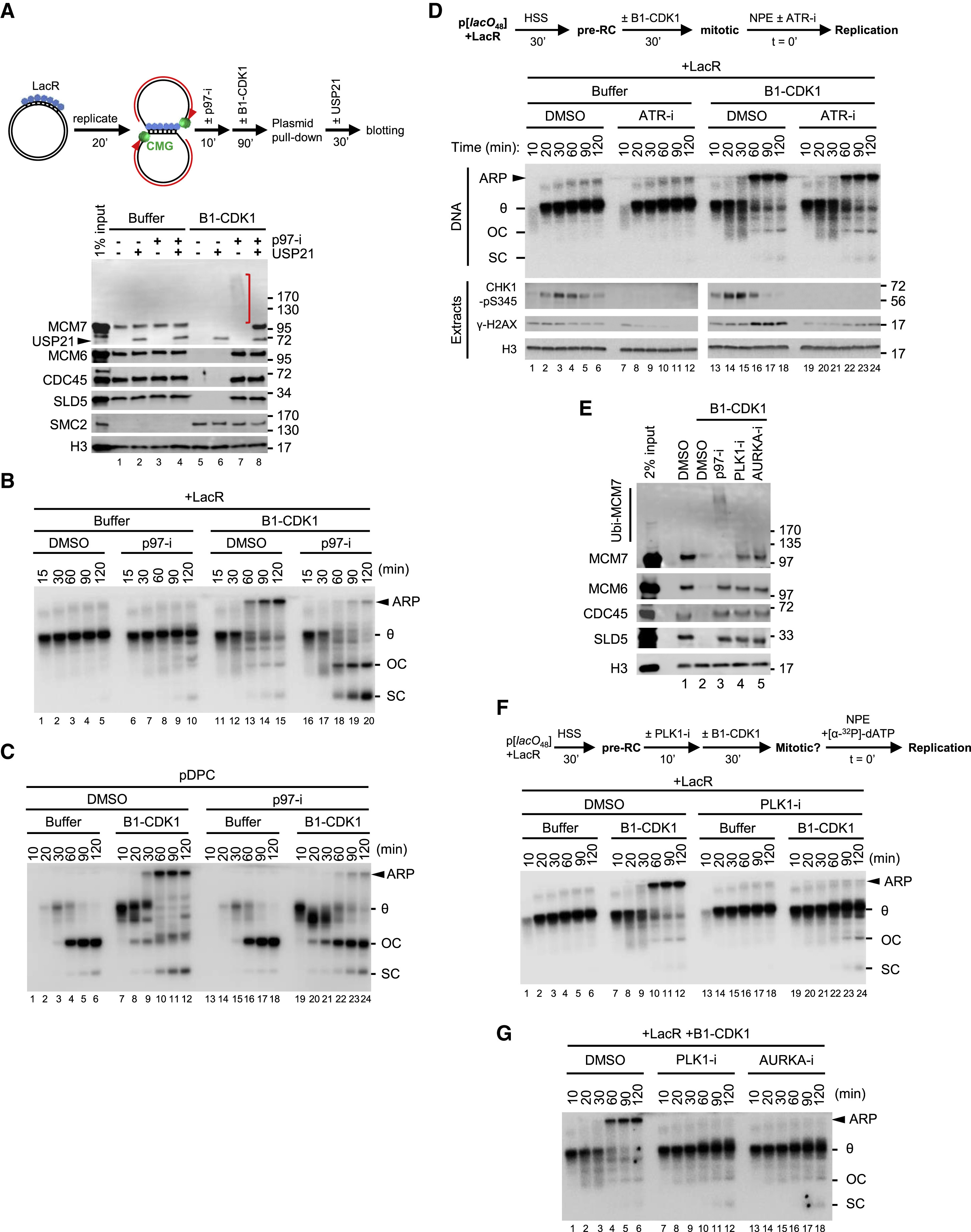 Figure 4. Mitotic CDK-Induced Fork Collapse Requires p97-Dependent CMG Unloading (A) The LacR-bound p[lacO48] plasmid was replicated and treated as schemed. Chromatin-bound proteins were recovered and blotted with the indicated antibodies. Red bracket, ubiquitylated MCM7. Histone H3 served as a loading control. Note that the MCM7 antibody cross-reacts with USP21. (B) LacR-bound p[lacO48] was replicated in the presence or absence of p97-i and B1-CDK1, as indicated. (C) pDPC was replicated in the presence or absence of p97-i and B1-CDK1, as indicated. ARP, OC+SC, and overall DNA replication are quantified in Figure S4G. (D) Effect of ATR inhibition on stalled replication forks. The LacR-bound p[lacO48] plasmid was replicated as schemed. The final concentration of the ATR inhibitor (ATR-i; ETP-46464) in the reactions was 200 μM. Extracts with [α-32P]-deoxyadenosine triphosphate (dATP) were sampled to track DNA replication, whereas extracts without [α-32P]-dATP were sampled in parallel to track CHK1-S345 phosphorylation (CHK1-pS345), γ-H2AX. Histone H3 was included as a loading control. (E) The LacR-bound p[lacO48] plasmid was replicated and treated as in (A). The final concentrations of PLK1 inhibitor (PLK1-i, BI-2536) and Aurora kinase A inhibitor (AURKA-i, MLN-8237) were 50 μM and 10 μM, respectively. DMSO and p97-i treatments were included as controls. Chromatin-bound proteins were recovered and blotted with the indicated antibodies. (F) LacR-bound p[lacO48] was replicated as schemed. PLK1-i was added 10 min before B1-CDK1 treatment, with a final concentration of 50 μM in the overall reaction. (G) LacR-bound p[lacO48] was replicated in the presence of PLK1-i or AURKA-i, as schemed in (F). The final concentrations of PLK1-i and AURKA-i were 50 μM and 10 μM, respectively. See also Figure S4. |