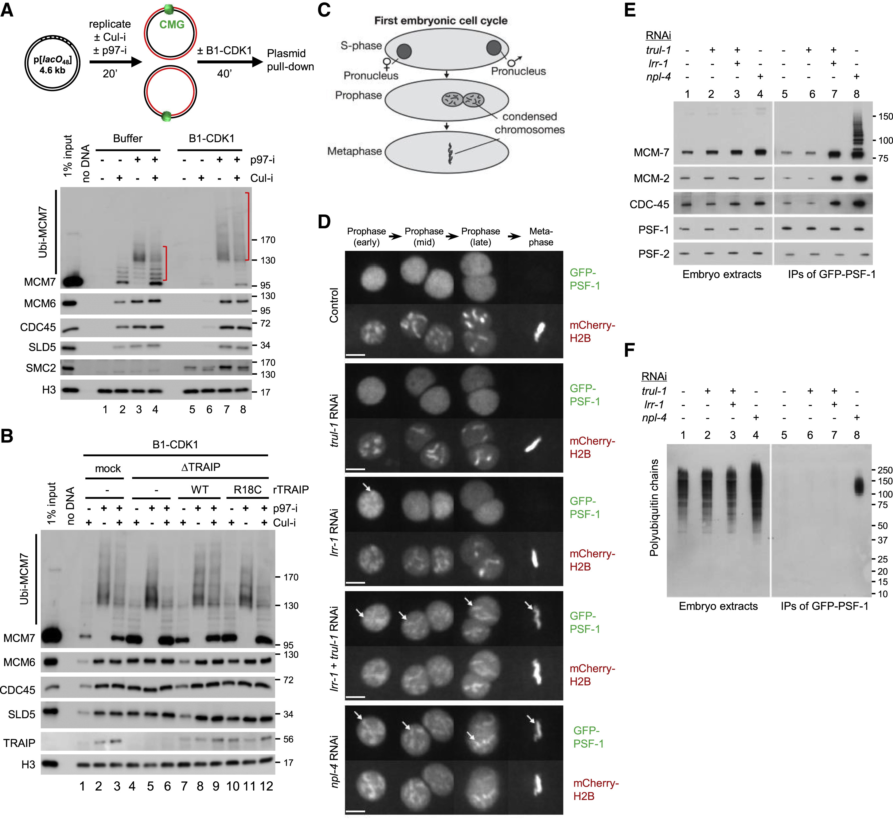 Figure 6. TRAIP Mediates Unloading of Terminated CMGs in Mitosis (A) The p[lacO48] plasmid, in the absence of LacR, was replicated and treated as schemed. Chromatin-bound proteins were recovered and blotted with the indicated antibodies. Red brackets indicate the levels of MCM7 ubiquitylation. (B) The p[lacO48] plasmid, in the absence of LacR, was replicated in mock-depleted or TRAIP-depleted egg extracts supplemented with or without rTRAIPWT (â¼4-fold of endogenous TRAIP) or rTRAIPR18C (â¼9-fold of endogenous TRAIP), followed by the indicated treatments. Chromatin-bound proteins were recovered and blotted with the indicated antibodies. (C) Illustration of the first cell cycle of the C. elegans embryo. Following S phase, the female and male pronuclei migrate toward each other, and chromosomes condense during prophase. Subsequently, the two sets of chromosomes intermingle during metaphase. (D) Time-lapse video microscopy of the first embryonic mitosis in embryos exposed to the indicated RNAi and expressing GFP-PSF-1 and mCherry-histone H2B. The female pronucleus is shown during early prophase, before convergence with the male pronucleus (mid-prophase and late prophase). The arrows indicate examples of persistence of GFP-PSF-1 on condensed chromatin during mitosis. Scale bar, 5 μm. (E and F) Worms in which the PSF-1 subunit of the CMG helicase was tagged with GFP were subjected to the indicated RNAi treatment. GFP-PSF-1 was recovered by immunoprecipitation, and the association of the indicated proteins was then monitored by immunoblotting against the indicated proteins (E) or ubiquitin (F). See also Figure S6. |