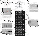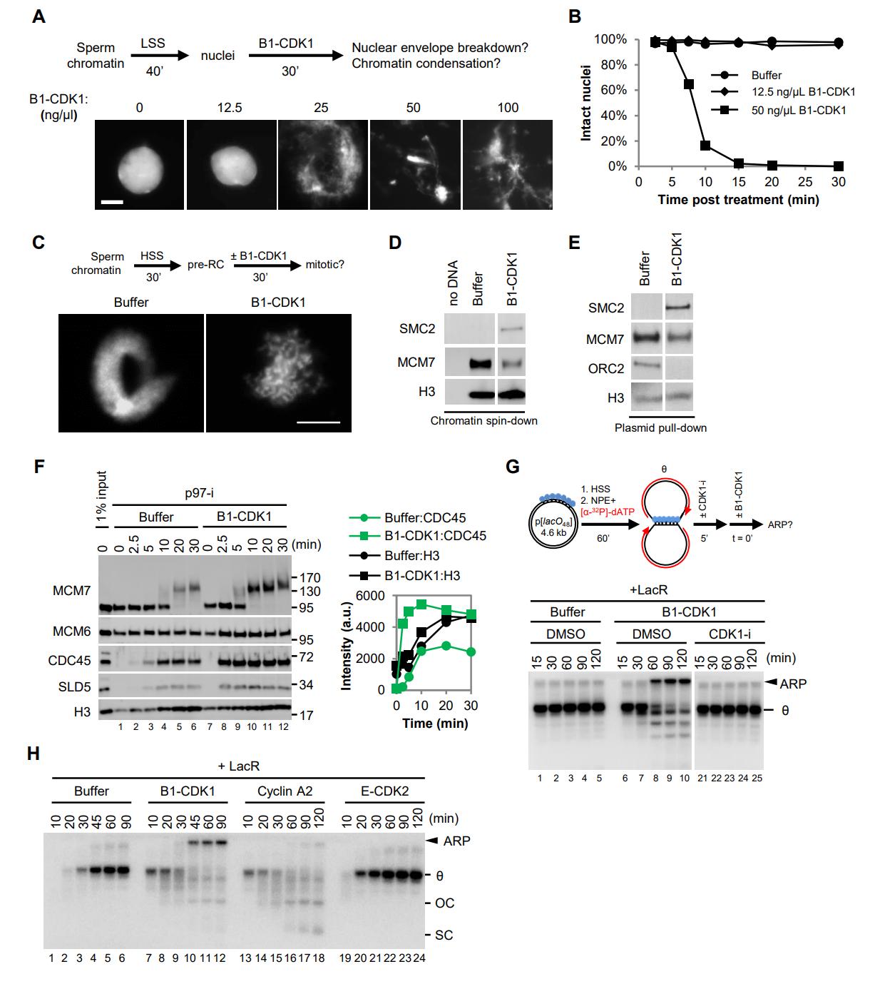 Figure S1, related to Figure 1. (A) To determine the concentration of mitotic B1-CDK1 that efficiently induces nuclear envelope breakdown and chromatin condensation, de-membranated Xenopus sperm chromatin was incubated in LSS (low speed supernatant) for 40 minutes to allow the formation of pseudo nuclei. The indicated final concentrations of B1-CDK1 were then added into the reactions for 30 minutes before Hoechst staining and imaging. 50 ng/µL of B1-CDK1 was sufficient to induce nuclear envelope breakdown and chromatin condensation and it was used for subsequent experiments unless otherwise indicated. Scale bar, 10 µm.(B) Percentage of intact nuclei remaining at the indicated time points after treatment with the indicated concentration of B1-CDK1 (n>1,000). The â0 minuteâ time point refers to Buffer or B1-CDK1 addition. The value at each time point was normalized to the value at 0 minute in each treatment. (C) Chromatin condensation assay in membrane-free HSS. Sperm chromatin was incubated in HSS for 30 minutes, and then treated with 50 ng/µL of B1-CDK1 for 30 minutes followed by Hoechst staining and imaging. Scale bar, 10 µm. (D) Sperm chromatin spin-down assays in HSS. Sperm chromatin was incubated with HSS for 30 minutes and treated with Buffer or 50 ng/µL of B1-CDK1 for another 30 minutes. Chromatin DNA was recovered and chromatin-bound proteins were blotted with indicated antibodies. Unrelated lanes were cropped as indicated by the gap. (E) Plasmid pull-down assays in HSS. pBlueScript (3 kb) was incubated with HSS at a concentration of 7.5 ng/µL for 30 minutes and treated with Buffer or 50 ng/µL of B1-CDK1 for another 30 minutes. Plasmid was recovered and chromatin-bound proteins were blotted with indicated antibodies. Unrelated lanes were cropped as indicated by the gap. (F) Plasmid pull-down assay to assess origin firing. pBlueScript was incubated with HSS for 30 minutes and treated with buffer or 50 ng/µL of B1-CDK1 for another 30 minutes before addition of NPE. The p97 inhibitor NMS-873 (p97-i) was added into NPE (final concentration, 266 µM) and incubated for 15 minutes. Treatment of p97-i blocked the unloading of CMG helicases from chromatin and trapped ubiquitylated MCM7 on chromatin, seen as a smear. Right panel shows the quantification of the CDC45 and Histone H3 signals. Increased CDC45 loading with B1-CDK1 treatment suggested more origin firing. (G) LacR-bound p[lacO48] was replicated in interphase egg extracts for 60 minutes and then treated with DMSO or CDK1 kinase inhibitor (CDK1-i, 333 µM RO-3306) for 5 minutes before the addition of Buffer or 50 ng/µL of B1-CDK1. At the indicated times, samples were withdrawn and replication products were tracked by electrophoresis and autoradiography. ARP, aberrant replication product; θ, theta structure. (H) LacR-bound p[lacO48] was replicated in the presence of B1-CDK1, Cyclin A2 and cyclin E-CDK2, with a final concentration of 50 ng/µL, respectively. OC, open circle; SC, supercoil; θ, theta structure; ARP, aberrant replication product. |