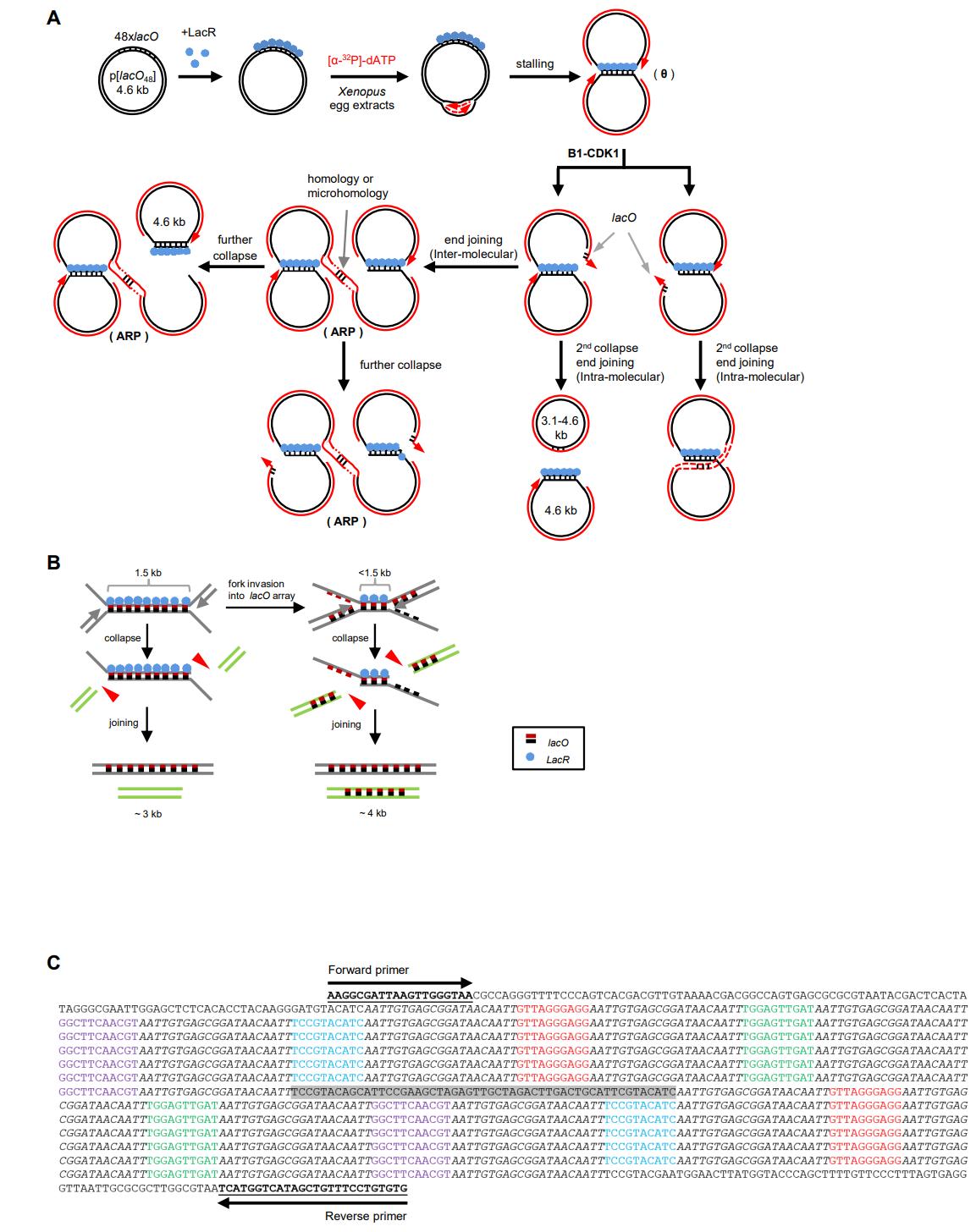 Figure S2, related to Figure 2. (A) Model for mitotic processing of replication forks stalled by lacO-LacR barriers, explaining the restriction analysis (Figure 2B) and sequencing data (Figure 2D). After replication fork stalling, B1-CDK1 induces fork collapse and double-strand breaks (DSBs) at the edges of the lacO array. The broken DNA ends, with certain number of lacO repeats or microhomology, lead to either intra- or inter-molecular end joining. Intermolecular end joining generates the aberrant replication products (ARPs). The initial end joining products can also be subject to cycles of fork collapse and end joining.Outcomes other than those illustrated here are possible but may not be detected because our sequencing strategy depends on the ability to recover plasmids by cloning. Although it has not been addressed whether the leading or lagging strand templates break, the results on CMG unloading (see below and text for details) favor leading strand breakage.(B) Schematic of B1-CDK1-induced fork breakage at different locations in the lacO array. Breakage at the outer edges (left) and joining of the resulting one-ended breaks creates large deletions of the array, whereas breakage closer to the midpoint of the array causes smaller deletions (right). (C) Sequence and structure of the 48 lacO repeats in p[lacO48]. Each lacO repeat is in italic. Unique spacer sequences between lacO repeats are labeled in red, green, purple and blue, respectively, as depicted in Figures 2D and 2E. The sequence in grey indicates a unique spacer in the middle of the lacO array. Sequencing primers used in Figure 2D are indicated |