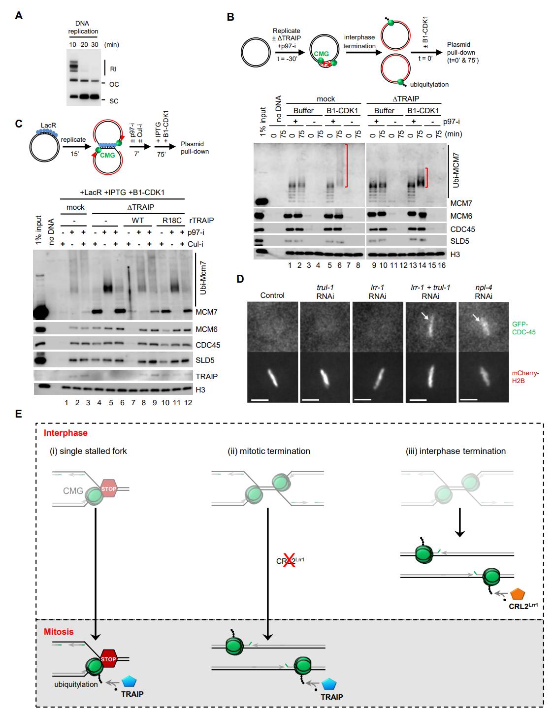 Figure S6, related to Figure 6. (A) p[lacO48], in the absence of LacR, was replicated in egg extracts used in Figures 6A and 6B. DNA replication was complete in 20 minutes. RI, replication intermediate; OC, open circle; SC, supercoil. (B) A 3.1 kb plasmid (pJD152 in (Dewar et al., 2015)) was replicated in mock-depleted or TRAIP-depleted extracts in the presence or absence of p97-i (to trap terminated and ubiquitylated CMGs on chromatin) followed by Buffer or B1-CDK1 treatment. Chromatin-bound proteins were recovered and blotted with indicated antibodies. Red brackets indicate the levels of MCM7 ubiquitylation. Note the dramatic smear of MCM7 ubiquitylation in the presence of B1-CDK1 in mock (compare lanes 6 and 2) and the shrinkage with TRAIP depletion (compare lanes 14 and 6). (C) LacR-bound p[lacO48] plasmid was replicated in mock-depleted or TRAIP-depleted egg extracts with or without recombinant rTRAIPWT (~4-fold of endogenous TRAIP), or rTRAIPR18C (~9-fold of endogenous TRAIP), and treated as schemed. Chromatin-bound proteins were recovered and blotted with the indicated antibodies. (D) Worm embryos expressing GFP-CDC-45 and mCherry-Histone H2B were subjected to the indicated RNAi treatment. The images correspond to metaphase of the first embryonic cell cycle, and the arrows indicate persistence of GFP-CDC-45 on condensed chromatin. Scale bar, 5 µm. (E) Comparison of different CMG unloading pathways. Mitotic CMG unloading at single stalled fork (i) occurs when a single stalled CMG on ssDNA enters mitosis (or in environment with high mitotic CDK activity). TRAIP is activated by mitotic CDK to trigger CMG ubiquitylation. Mitotic termination (ii) occurs when CRL2Lrr1 is deficient (Sonneville et al., 2017). CMGs at terminated replication forks are ubiquitylated upon mitotic entry in a TRAIP-dependent manner. During replication termination in interphase (iii), two CMGs bypass each other and translocate from ssDNA to dsDNA, triggering CRL2Lrr1 dependent CMG ubiquitylation (Dewar et al., 2015; Dewar et al., 2017; Sonneville et al.,2017). The cartoons highlight the requirement of E3 ubiquitin ligase activity rather than physical localization for CMG ubiquitylation |