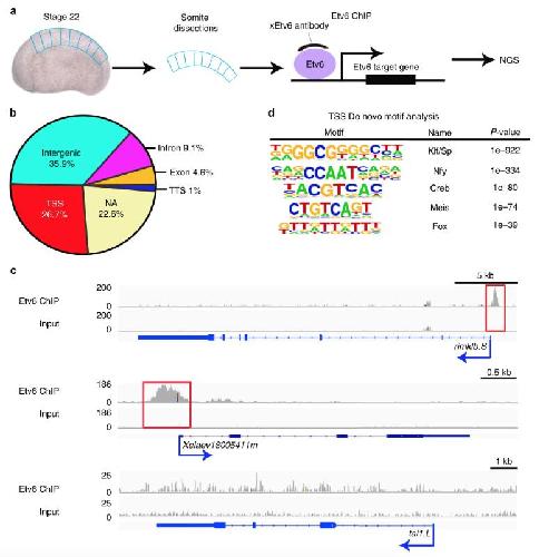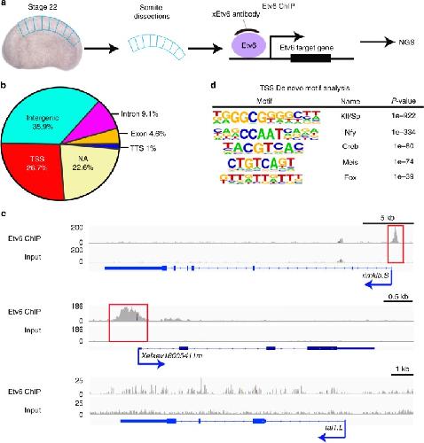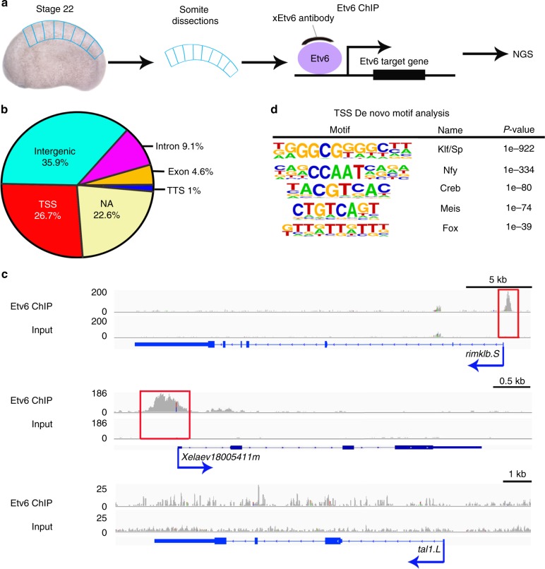 Fig. 1. Genome-wide occupancy of Etv6 in Xenopus somites at stage 22. a Experimental design of Etv6 ChIP-seq assay. The somites were dissected from stage 22 Xenopus laevis embryos, homogenized and fixed, and subjected to Etv6 ChIP-seq. NGS, next-generation sequencing. b Genomic distribution of the 9128 Etv6 ChIP-seq peaks throughout the X. laevis genome. NA, not annotated; TSS, transcription start site; TTS, transcription termination site. c Integrative genome viewer (IGV) showing examples of Etv6 ChIP-seq tracks. Etv6 binding is enriched in the TSS region of rimklb.S and Xelaev18005411m (red boxes) but not in the TSS region of tal1.L. Input is shown as control. The consensus peaks were generated using DiffBind; for the peak tracks of individual replicates, see Supplementary Figure 13. d De novo motif analysis of ETV6 peaks located in the TSS region. Five out of the 22 overrepresented motifs are shown |