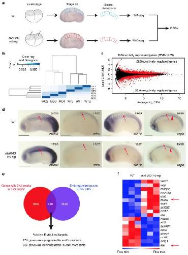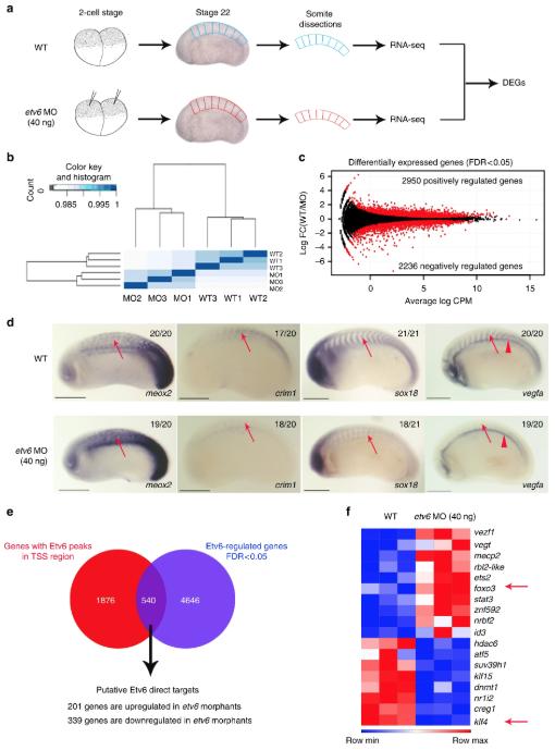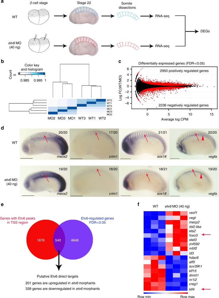Fig. 2. Identification of Etv6 direct transcriptional targets in the somites. a Experimental design. RNA-seq was performed on wild type (WT) and Etv6-deficient (etv6 MO-injected embryos) somite explants dissected from stage 22 embryos. Differentially expressed genes (DEGs) were identified by comparing the transcriptome of these tissues. b Spearman correlation analysis on triple biological RNA-seq replicates. c MA plot (magnitude of the difference versus amplitude of the signal) showing the fold-change in gene expression of all genes in WT versus Etv6-deficient somites (log2FC) compared to their expression levels (log2CPM). Black dots, non-significant change; red dots, differentially expressed genes (DEGs). The number of positively and negatively regulated DEGs is indicated. d WISH showing the expression of DEGs in stage 22 WT and Etv6-deficient embryos. Meox2 expression is upregulated in the somites (arrows) in Etv6-deficient embryos whereas expression of crim1, sox18 and vegfa is downregulated. Note that vegfa expression in the hypochord is unaffected (arrowheads). Embryos are shown in lateral view with anterior to the left and dorsal to the top. Numbers in top right corner indicate the number of embryos exhibiting the phenotype pictured (scale bars: 0.5âmm). e The intersection between DEGs and genes harbouring Etv6 ChIP-seq peaks in their TSS region reveals 540 putative direct target genes. f Foxo3 and klf4 (arrows), known transcriptional regulators of vegfa, are amongst the 18 TFs and chromatin modifiers identified as potential direct transcriptional targets of Etv6 |