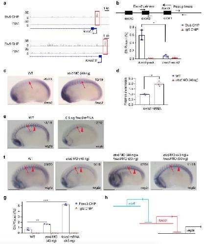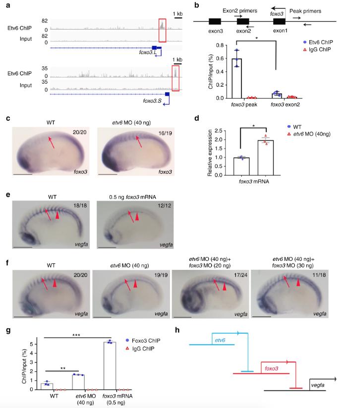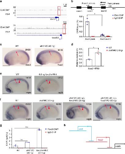 Figure 3 Etv6 prevents Foxo3-mediated repression of vegfa in the somites. a IGV showing Etv6 peaks (red boxes) in the TSS region of foxo3.L and foxo3.S. Input is shown as control. For the peak tracks of individual replicates, see Supplementary Figure 13. b ChIP-qPCR analysis confirming that Etv6 binding is enriched in the foxo3 promoter region. The diagram above the histogram depicts the foxo3 locus and the location of the primers used to amplify the region of the Etv6 peak in the foxo3 TSS region (peak primers) and a negative control region in exon2 (exon2 primers). Primers were designed to target both foxo3.L and foxo3.S. IgG ChIP was used as negative control. Error bars represent SEM of three biological replicates. *Pâ=â0.014, two-tailed Studentâs t-test. c WISH showing that foxo3 expression is upregulated in the somites (arrows) of Etv6-deficient (etv6 MO) embryos (scale bars: 0.5âmm). d RT-qPCR confirming that foxo3 is upregulated in stage 22 Etv6-deficient somites. Expression was normalized to odc1. Error bars represent SEM of three biological replicates. *Pâ=â0.020, two-tailed Studentâs test. e WISH showing that overexpression of foxo3 (0.25âng foxo3.L mRNAâ+â0.25âng foxo3.S mRNA) blocks vegfa expression in the somites (arrows) whereas expression in the hypochord (arrowheads) is unaffected (scale bars: 0.5âmm). f WISH showing that blocking foxo3 translation with MOs rescues vegfa expression in the somites (arrows) of Etv6-deficient (etv6 MO) embryos. Arrowheads indicate expression in the hypochord (scale bars: 0.5âmm). g Foxo3 ChIP-qPCR on the vegfa promoter region. The assay was performed on somitic material isolated from wild-type, Etv6-deficient (etv6 MO) and foxo3 mRNA overexpressing embryos at stage 22. IgG ChIP was used as negative control. Error bars represent SEM of three biological replicates. **Pâ=â0.0014, ***Pâ=â0.00018, two-tailed Studentâs t-test. h Diagram illustrating that vegfa expression in the somites requires the repression of foxo3 by Etv6, i.e., Etv6 represses a repressor of vegfa. Images in c, e, f show stage 22 embryos in lateral view with anterior to the left and dorsal to the top. Numbers in top right corner indicate the number of embryos exhibiting the phenotype pictured |