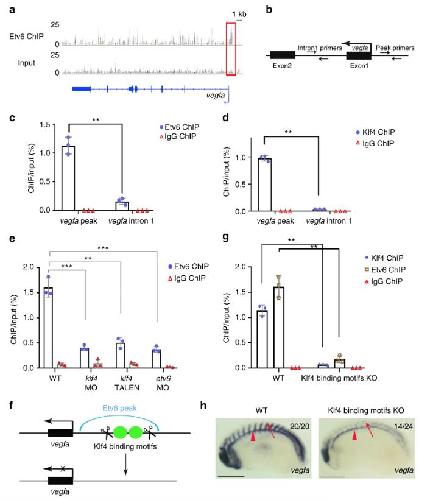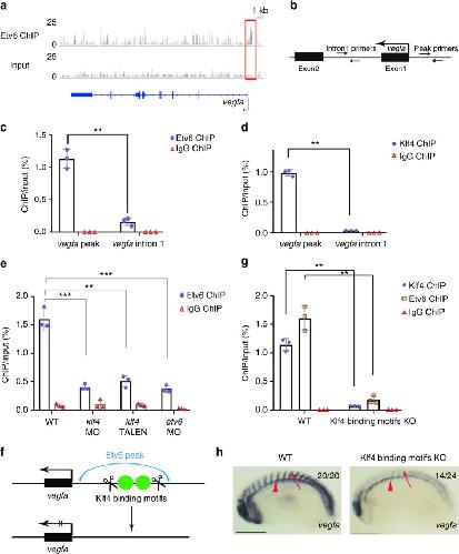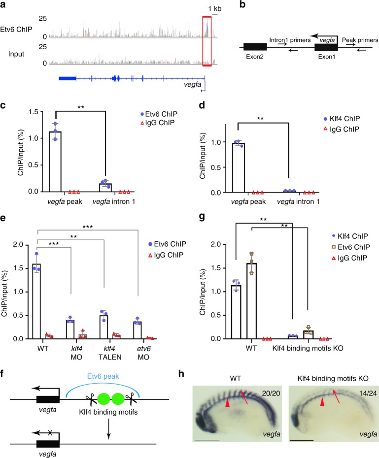 Fig. 5. Klf4 is required for the recruitment of Etv6 to the vegfa promoter. a IGV view of Etv6 peaks reveals a peak (red box) in the TSS region of vegfa. Input is shown as control. For the peak tracks of individual replicates, see Supplementary Figure 13. b Partial representation of the vegfa locus showing the location of the primers used to amplify the region of the Etv6 peak in the vegfa TSS region (peak primers) and a negative control region in intron1 (intron1 primers). c, d ChIP-qPCR analysis on stage 22 somite explants confirming that Etv6 (c) and Klf4 (d) are enriched in the promoter region of vegfa. IgG ChIP was used as negative control. Error bars represent SEM of three biological replicates. **Pâ=â0.003 (c), **Pâ=â0.0011 (d), two-tailed Studentâs t-test. e The enrichment of Etv6 in the vegfa promoter is significantly reduced in Klf4-depleted (40âng klf4 MO and 0.5âng klf4 TALEN) stage 22 somites. This reduction is comparable to that produced by the depletion of Etv6 (40âng etv6 MO), strongly indicating that Klf4 is required for Etv6 recruitment to the vegfa promoter. IgG ChIP was used as negative control. Error bars represent SEM of three biological replicates. ***Pâ=â0.0002 WT vs klf4 MO, **Pâ=â0.002 WT vs klf4 TALEN, ***Pâ=â0.000065 WT vs etv6 MO, two-tailed Studentâs t-test. f Diagram showing the TALENs designed to delete the Klf4 binding motifs under the Etv6 peak in the vegfa promoter region. g The enrichment of Klf4 and Etv6 in the vegfa promoter region is significantly reduced in the somites of Klf4 binding motifs knockout (KO) embryos. IgG ChIP was used as negative control. Error bars represent SEM of three biological replicates. **Pâ=â0.0033 for Klf4 ChIP-qPCR, **Pâ=â0.0047 for Etv6 ChIP-qPCR, two-tailed Studentâs t-test. h WISH showing that vegfa expression is downregulated in the somites of Klf4 binding motifs KO embryos, whereas expression in the hypochord (arrowheads) is not affected (scale bars: 0.5âmm) |