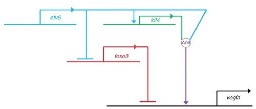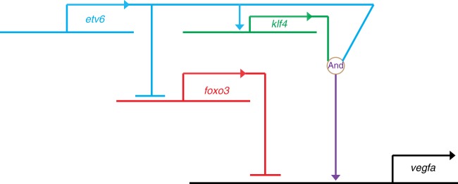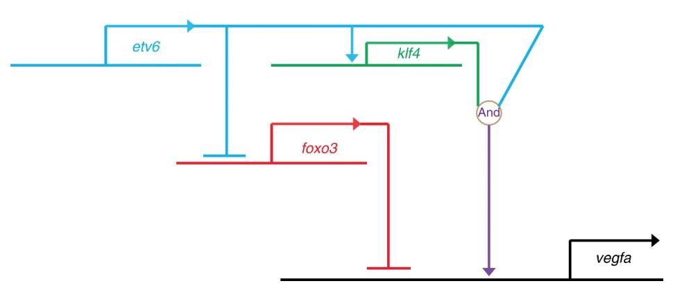Fig. 7. GRN summarizing the mechanisms by which Etv6 regulates the expression of vegfa. Etv6 positively regulates vegfa expression in the somites through multiple mechanisms. It represses the transcription of foxo3, a repressor of vegfa expression. In parallel, it activates the expression of klf4, an activator of vegfa. Finally, Klf4 is required for Etv6 recruitment to the vegfa promoter to activate its expression. In conclusion, a network of positive and negative inputs from Etv6 is required for transcriptional activation of vegfa in the somites |