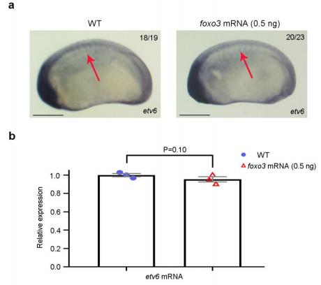 Supplementary Figure 4. Etv6 expression in the somites is not affected in foxo3 overexpressed embryos. (a) WISH showing etv6 expression in the somites (arrows) of stage 22 WT, and foxo3 overexpressed embryos. Embryos are shown in lateral view with anterior to the left and dorsal to the top. Numbers in top right corner indicate the number of embryos exhibiting the phenotype pictured (scale bars: 0.5 mm). (b) RT-qPCR confirming that similar levels of etv6 mRNA are expressed in the somites of WT and foxo3 overexpressed embryos at stage 22. Expression was normalized to odc1. Error bars represent SEM of three biological replicates. |