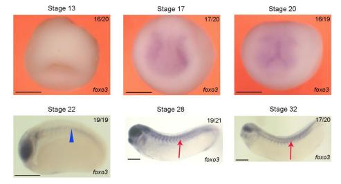 Supplementary Figure 6. WISH showing the expression pattern of foxo3 during early Xenopus development. Foxo3 mRNA is not detected before stage 22 of development. At stage 22, its expression is detected in the notochord (arrowhead). Expression in the somites is detected at stage 28, i.e. after the establishment of definitive hemangioblast in the lateral plate mesoderm. Arrows in stage 28 and 32 embryos indicate expression in the somites. Stage 13-20 embryos are shown in anterior view with dorsal to the top. Stage 22-32 embryos are shown in lateral view with anterior to the left and dorsal to the top. Numbers in top right corner indicate the number of embryos exhibiting the phenotype pictured (scale bars: 0.5 mm). |