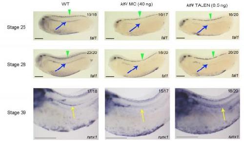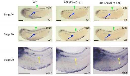 Supplementary Figure 9. Klf4 is required for the emergence of HSC. WISH demonstrating that the establishment of definitive hemangioblasts in the lateral plate mesoderm, as indicated by tal1 expression (arrows in stage 26 and 28 embryos), and hemogenic endothelium in the ventral wall of the dorsal aorta, as indicated by runx1 expression (arrows in stage 39 embryos), is impaired in klf4-deficient embryos. Arrowheads in stage 26 and 28 embryos indicate expression of tal1 in neurons, which is unaffected by klf4 depletion. Embryos are shown in lateral view with anterior to the left and dorsal to the top. Numbers in top right corner indicate the number of embryos exhibiting the phenotype pictured (scale bars: 0.5 mm). |