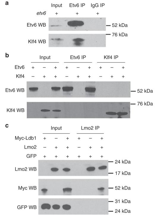 Figure 6 Etv6 and Klf4 interact indirectly with each other. a In vivo immunoprecipitation assay showing the interaction between Etv6 and Klf4. Protein extracts from the somites of stage 22 embryos overexpressing etv6 mRNA were used for immunoprecipitation. Input lane: somite extracts from embryos injected with exogenous etv6 mRNA; IgG immunoprecipitation: negative control. b In vitro immunoprecipitation assay showing that Etv6 and Klf4 do not directly interact. The Etv6 and Klf4 proteins were synthetized from mRNA using the in vitro rabbit reticulocyte lysate translation system, extracted and used in immunoprecipitation assays with Etv6 antibodies (Etv6 IP) or Klf4 antibodies (Klf4 IP). c In vitro immunoprecipitation assay between two proteins known to physically interact with each other, Lmo2 and Ldb1, was performed as in (b) with Lmo2 antibodies (Lmo2 IP). The GFP protein serves as a negative control |
