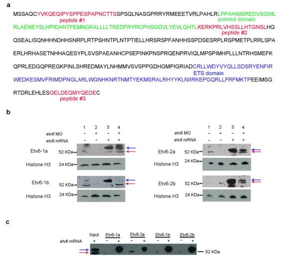 Supplementary Figure 1. Generation and characterization of ChIP grade antibodies against Xenopus Etv6. (a) Amino acid sequence for Xenopus Etv6 (Accession Number NP_001124423.1). Pointed domain and ETS domain are indicated in green and blue, respectively. The sequences of the three peptides used for the generation of antibodies are indicated in red. Two rabbit polyclonal antibodies were obtained per peptide: Etv6-1a, -1b, -2a -2b, -3a, -3b. (b) Western blot validating the specificity of Etv6 antibodies. Protein extracts from stage 22 wild-type (WT), Etv6-deficient (etv6 MO), etv6-overexpressing (HA-etv6 mRNA) or Etv6-deficient + etv6-overexpressing (etv6 MO+HA-etv6 mRNA) somites were used for western blot analysis. While polyclonal antibodies generated from peptide 1 (Etv6-1a and Etv6-1b) and peptide 2 (Etv6-2a and Etv6-2b) detect both endogenous and exogenous expression of Etv6, polyclonal antibodies generated from peptide 3 (Etv6-3a and Etv6-3b) did not detect expression of Etv6 and cross-reacted with an unknown protein (data not shown). Lane 1, WT; lane 2, 40 ng etv6 MO; lane 3, 1.0 ng etv6 mRNA; lane 4, 40 ng etv6 MO + 1.0 ng etv6 mRNA. The predicted molecular weight of Etv6 is around 52 KDa. (http://web.expasy.org/compute_pi/). Blue and red arrows point to exogenous and endogenous expression of Etv6, respectively. (c) Immunoprecipitation assay validating the affinity of anti Xenopus Etv6 antibodies to endogenous Etv6. Protein extracts from the somites of stage 22 WT embryos were used for immunoprecipitation; somite extracts from embryos injected with exogenous etv6 mRNA were used as positive control. Polyclonal antibodies generated from peptide 1 (Etv6-1a and Etv6-1b) and peptide 2 (Etv6-2a and Etv6-2b) were tested for their capacity to immunoprecipitate Etv6 protein. Western blot was performed using antibody Etv6-1b as primary antibody. Blots show that antibodies Etv6-2a and Etv6-2b could immunoprecipitate endogenous Etv6 protein. Antibody Etv6-2a showed greater affinity to Etv6 and was selected for subsequent experiments. Blue and red arrows point to exogenous and endogenous expression of Etv6, respectively. |