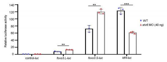 Supplementary Figure 3. The sequences underlying the Etv6 peaks in the promoters of klf4 and foxo3 exhibit positive and negative transcriptional activities, respectively. Luciferase reporter assays were used to test the transcriptional activity of Etv6-bound sequences in klf4 and foxo3 promoters. The vectors (control-luc, foxo3.L-luc, foxo3.S-luc and klf4-luc) were injected in 2-cell stage embryos on their own or co-injected with etv6 MO to perform analyses on wild-type (WT) or Etv6-deficient backgrounds, respectively. Luciferase activity was measured on stage 22 somitic material. In comparison to empty luciferase vector (control-luc), the three Etv6-bound sequences induced the expression of the luciferase reporter in WT embryos. The transcriptional activities of the foxo3 promoter Etv6 peak were significantly upregulated in Etv6-deficient embryos. In contrast, the activity of the klf4 promoter Etv6 peaks was significantly downregulated. This indicates that Etv6 activates klf4 transcription while repressing foxo3. Error bars represent SEM of three biological replicates. P(foxo3.L)=0.002, P(foxo3.S)=0.007, P(klf4)=0.0007, two-tailed Studentâs t-test. |