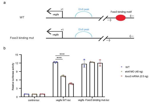 Supplementary Figure 7. The Foxo3 binding motif controls the transcriptional activity of the vegfa promoter. (a) Schematic diagram depicting the location of the conserved Foxo3 binding site in the Xenopus vegfa promoter. The location of the Etv6 ChIP peak is indicated in blue. Bottom diagram illustrates the Foxo3 binding site-deleted form in the vegfa promoter. Arrows indicate the sequences tested in luciferase assays. (b) Luciferase reporter assays were used to test the transcriptional activity of sequences containing the wild type Foxo3 binding motif (5'-GTAAACA-3') (vegfa WT-luc) or deleted of Foxo3 binding motif (vegfa-Foxo3 binding mut-luc), as depicted in (a). The vectors were injected in 2-cell stage embryos on their own or co-injected with etv6 MO or foxo3 mRNA to perform analyses on wild-type (WT), Etv6-deficient or foxo3 overexpressing backgrounds, respectively. Luciferase activity was measured on stage 22 somitic material. Note that luciferase activity driven by wild-type vegfa promoter sequences is significantly reduced in Etv6-deficient embryos or when foxo3 is overexpressed when compared to WT embryos. In contrast, when the Foxo3 binding motif is deleted from this sequence, luciferase activity is no longer repressed in Etv6-deficient embryos or when foxo3 is overexpressed. Error bars represent SEM of three biological replicates. ***P(WT/etv6 MO)= 3.0969E-05, ***P(WT/foxo3 mRNA)= 4.44051E-06, two-tailed Studentâs t-test. |