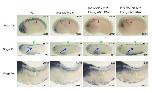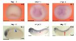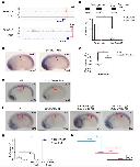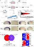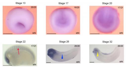 Supplementary Figure 8. WISH showing that klf4 is transiently expressed in the somites of Xenopus embryos. Klf4 mRNA is not detected before stage 22 of development. At stage 22, its expression is detected in the somites (red arrow) but this expression is extinguished by stage 26 (blue arrowhead indicates expression in the notochord). Yellow arrowhead in stage 32 embryo indicates expression in the head. Stage 13-20 embryos are shown in anterior view with dorsal to the top. Stage 22-32 embryos are shown in lateral view with anterior to the left and dorsal to the top. Numbers in top right corner indicate the number of embryos exhibiting the phenotype pictured (scale bars: 0.5 mm). |