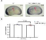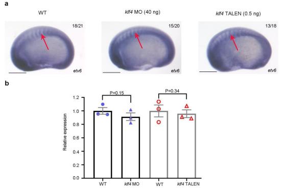 Supplementary Figure 10. Etv6 expression in the somites is not affected in klf4-deficient embryos. (a) WISH showing etv6 expression in the somites (arrows) of stage 22 WT, klf4 MOand klf4 TALEN-injected embryos. Embryos are shown in lateral view with anterior to the left and dorsal to the top. Numbers in top right corner indicate the number of embryos exhibiting the phenotype pictured (scale bars: 0.5 mm). (b) RT-qPCR confirming that similar levels of etv6 mRNA are expressed in the somites of WT and klf4-deficient embryos at stage 22. Expression was normalized to odc1. Error bars represent SEM of three biological replicates. |