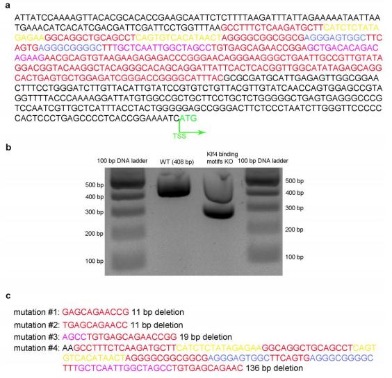 Supplementary Figure 11. Klf4 binding motifs in the vegfa promoter region were deleted using TALENs. (a) DNA sequence for the X. laevis vegfa promoter (-653 bp ~ +3 bp) containing the Etv6 ChIP peak. The Etv6-peak sequence is indicated in red; Klf4 binding motifs under Etv6-peak are indicated in blue; the transcription start site is indicated in green; the TALENs designed for deletion of the Klf4 binding motifs are indicated in yellow and purple, respectively. (b) TALEN activity generated a range of deletions in the vegfa promoter. Genomic DNA was obtained from 20 WT and TALEN-injected stage 22 somites and PCR-amplified. The smaller product detected from TALEN-injected somites when compared to WT somites (~270 bp versus ~400 bp) represents the majority of the mutated sequences, as shown in (c). (c) Sequences showing the range of mutations caused by TALEN injection. The PCR products obtained in (b) were cloned and Sanger sequenced. TALENs caused mutations in 100% of the clones sequenced (10/10). Mutation #1 was detected in two clones, mutation #2 in two clones, mutation #3 in one clone, and mutation #4 in five clones (50%). |