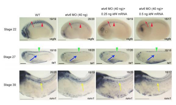 Supplementary Figure 12. Klf4 overexpression does not rescue the hematopoietic phenotype of Etv6-deficient embryos. WISH showing that vegfa expression in Xenopus somites (arrows in stage 22 embryos), tal1 expression in definitive hemangioblasts in the lateral plate mesoderm, (arrows in stage 27 embryos), and runx1 expression in hemogenic endothelium in the ventral wall of the dorsal aorta (arrows in stage 39 embryos) in wild-type (WT) embryos, Etv6-deficient (etv6 MO) embryos and in embryos deficient for Etv6 and overexpression klf4 mRNA (etv6 MO+klf4 mRNA). Note that klf4 overexpression does not rescue the hematopoietic phenotype of Etv6-deficient embryos. Arrowheads in stage 22 embryos indicate expression of vegfa in the hypochord, which is unaffected by Etv6 depletion. Arrowheads in stage 27 embryos indicate expression of tal1 in neurons, which is unaffected by Etv6 depletion. Embryos are shown in lateral view with anterior to the left and dorsal to the top. Numbers in top right corner indicate the number of embryos exhibiting the phenotype pictured (scale bars: 0.5 mm). |